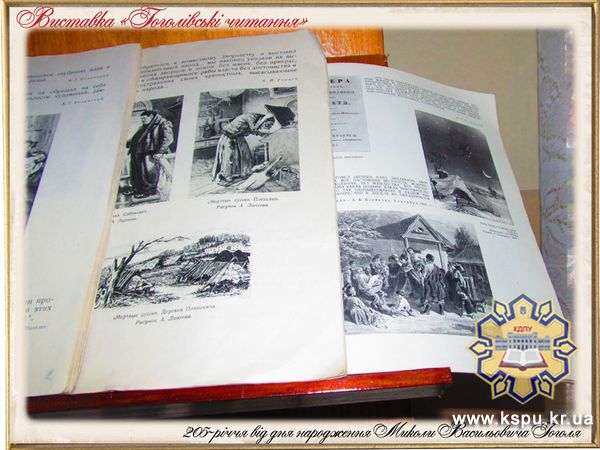 Твори М. Гоголя продовжують жити і захоплювати численних шанувальників його творчості. Виставка «Гоголівські читання» дає змогу користувачам ще раз розгорнути сторінки улюблених повістей письменника, перечитати та насолодитись яскравими ілюстраціями до відомих творів.