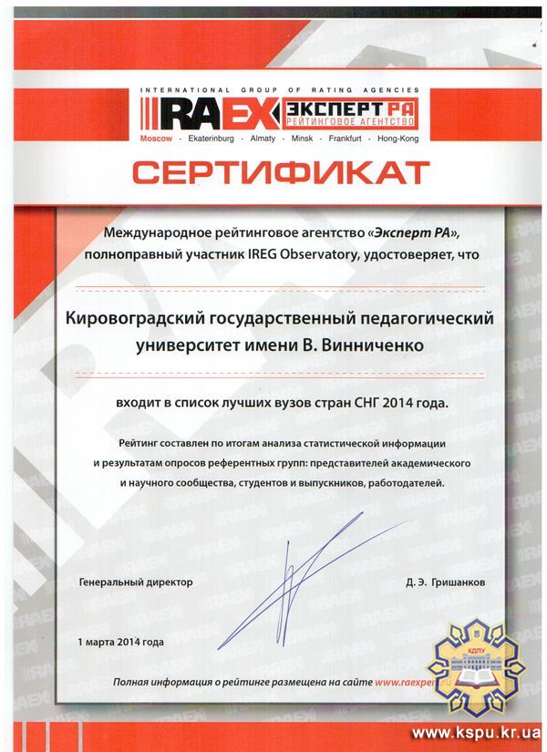 За результатами рейтингу, проведеного рейтинговим агентством “Експерт РА”, Кіровоградський державний педагогічний університет імені Володимира Винниченка ввійшов до переліку кращих вищих навчальних закладів країн СНД.