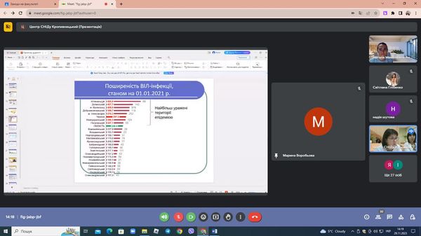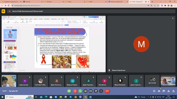 Важливо нагадувати про ризики зараження, знати способи захисту, розуміти важливість збереження якості життя, отримувати якісну підтримку держави. За ініціативи факультету педагогіки, психології та мистецтв ЦДУ ім. В.Винниченка 30 листопада на підтримку Всесвітньої акції "16 днів без насилля" та напередодні Всесвітнього дня боротьби зі СНІДом студенти факультетів Центральноукраїнського державного університету ім. В. Винниченка спілкувалися із фахівцями Кіровоградського центру профілактики та боротьби зі СНІДом - лікаркою-педіатром Радченко Ларисою Владленівною та медичною психологинею Шутовою Надією Іванівною.