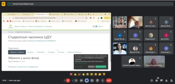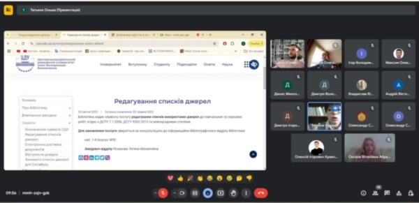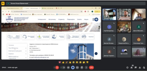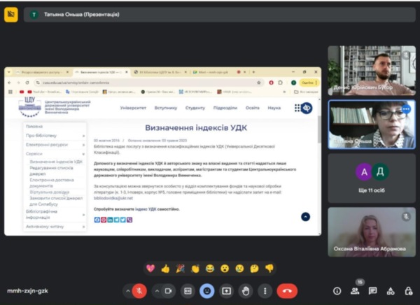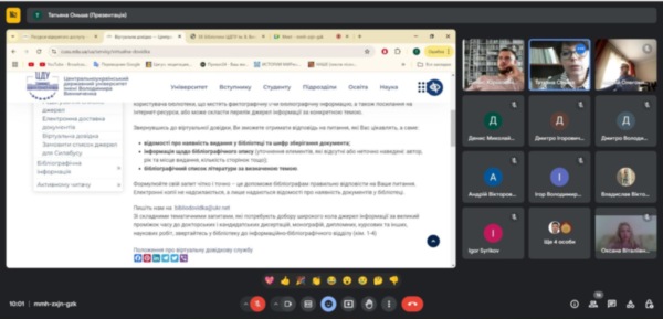 10 жовтня 2024 року на базі бібліотеки Центральноукраїнського державного університету імені Володимира Винниченка відбулася гостьова лекція в онлайн-форматі для аспірантів нашого навчального закладу. Лекція була проведена в межах викладання освітнього компонента «Інформаційні технології в науці» (викладач – кандидат педагогічних наук, доцент Оксана Абрамова).
