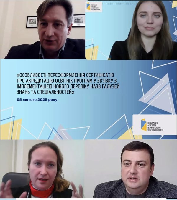 5 лютого 2025 року Національне агентство із забезпечення якості вищої освіти провело вебінар «Особливості переоформлення сертифікатів про акредитацію освітніх програм у зв’язку з імплементацією нового переліку галузей знань та спеціальностей».