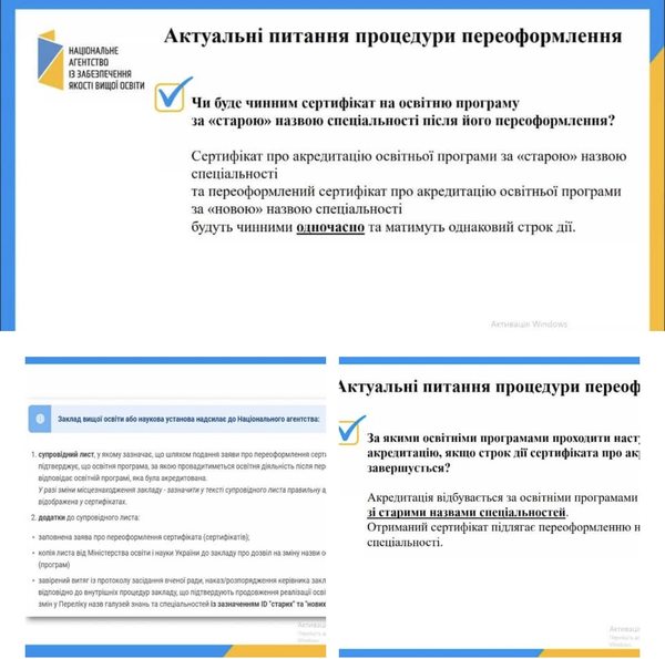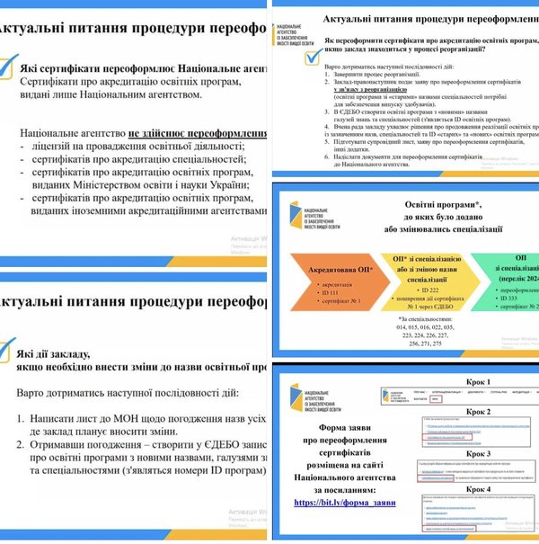 Під час вебінару голова Національного агентства Андрій Бутенко наголосив на пріоритетності діалогу із ЗВО. Керівник секретаріату Олександр Хименко окреслив нормативно-правові аспекти переоформлення сертифікатів. Представниця секретаріату Національного агентства Аліна Лепьохіна ознайомила учасників із особливостями оновленої заяви, порядком продовження сертифікатів, їхнім поширенням у ЄДЕБО та визнанням документів іноземних агентств. Наприкінці вебінару спікерка відповіла на нагальні питання учасників щодо зазначеної теми.