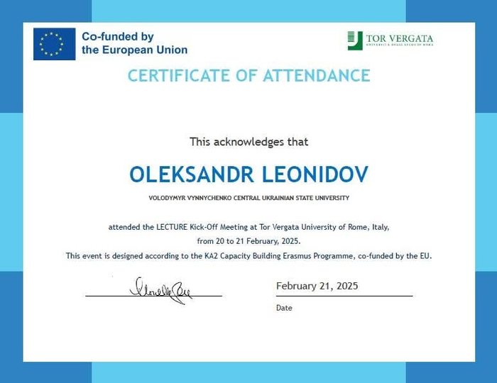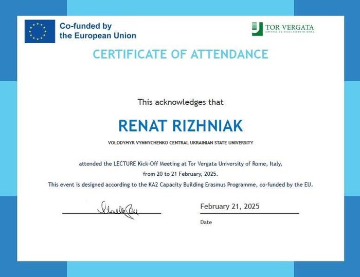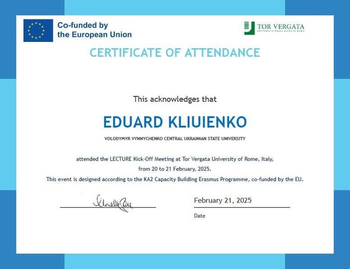 За результатами офіційної kick-off зустрічі учасників міжнародного проєкту Erasmus+, яка відбулася на факультеті літератури та філософії в другому університеті Італії — Tor Vergata (м. Рим), наші викладачі Ріжняк Р.Я., Клюєнко Е.О. і Леонідов О.М. отримали сертифікати.