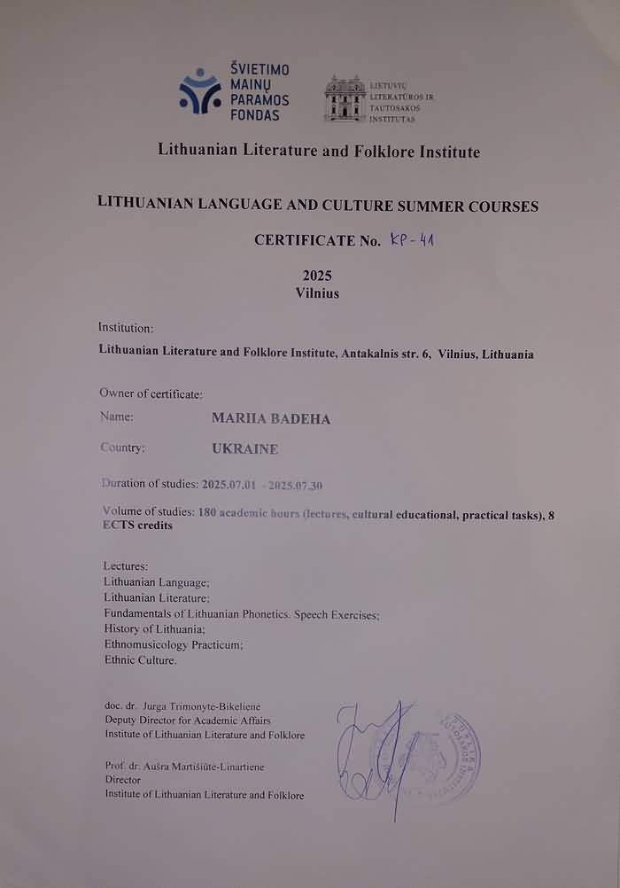 «Цьогоріч завдяки літнім курсам мови та культури (Lithuanian language and culture summer courses) від Інституту литовської літератури та фольклору (Lietuvių literatūros ir tautosakos institutas, LLTI) я отримала унікальну можливість: відвідати іншу країну, познайомитися з її культурою, історією, літературою, музикою, архітектурою, звичаями та традиціями; протягом місяця вивчати одну з найдавніших мов Європи; відвідати національні й археологічні пам’ятки Литви; познайомитися з чудовими людьми — як викладачами курсів, щирими й уважними, так і пересічними литовцями, котрі висловлювали підтримку нашому народові. Це дозволило відчути «душу нації» — те, чим вона живе і дихає.