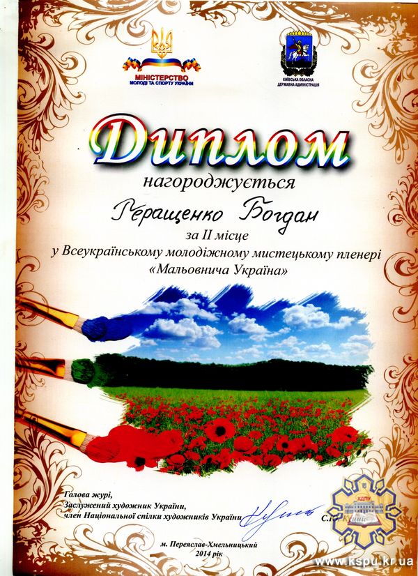 Приємно зазначити, що одним з переможців конкурсу став наш студент, Геращенко Богдан, який нагороджений дипломом за ІІ місце у Всеукраїнському молодіжному мистецькому пленері “Мальовнича Україна”.