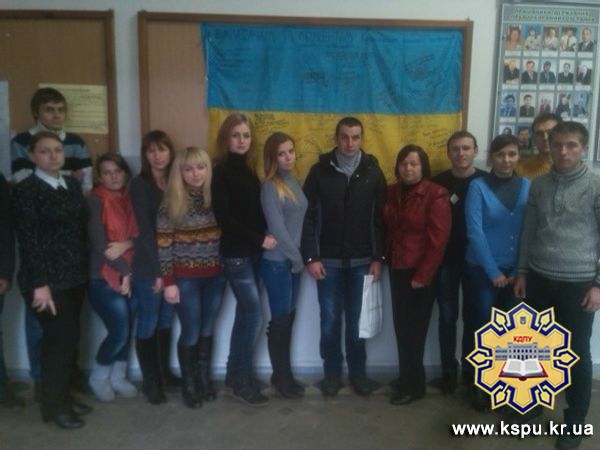 17 листопада 2014 року для студентів факультету історії та права був день подвійного свята. Сьогодні до нас завітав випускник нашого факультету – Пастухов Олександр, учасник АТО. Зараз він перебуває в зоні військових дій. Разом з бійцями захищає аеропорт міста Донецька. Пастухов Олександр воює більше пів року. Його відпустили всього на 5 днів відпочити і побачити рідних та друзів. Він не забув про рідні стіни свого університету і про нас. Саша прийшов привітати нас з Днем студента і від свого батальйону подарув нам прапор України з побажаннями від бійців-захисників Донецького аеропорту. Його розмістили на дошці оголошень. Тут збирається багато викладачів та студентів. Під час зустрічі, відповідаючи на численні запитання студентів, Олександр розповідав про своє ставлення до подій, до настроїв місцевих жителів Донбасу, говорить про патріотизм і наголошує на тому, що вони не відступлять і мужньо стоятимуть на кордоні до перемоги.