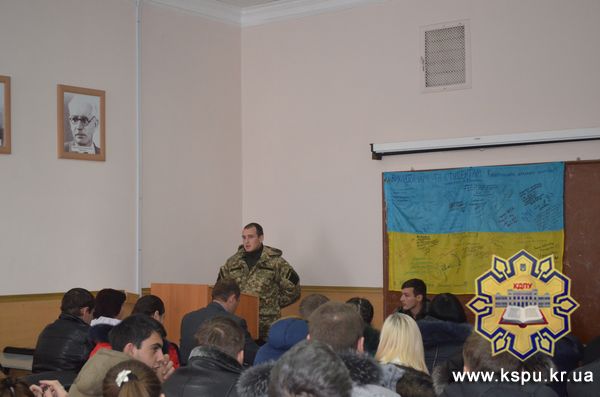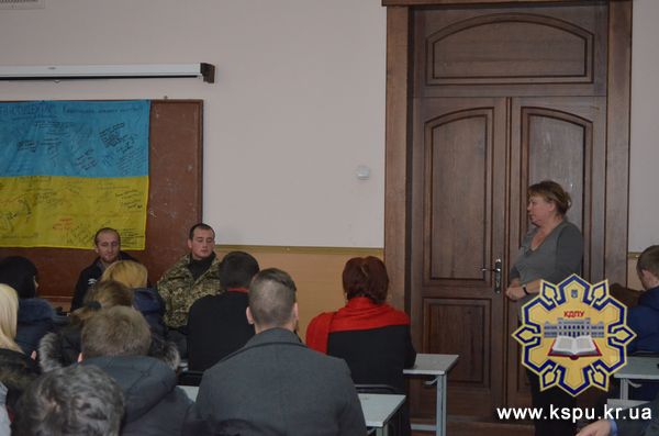 Біденко Наталія Іванівна, заступник декана з виховної роботи, виразила щиру вдячність і віддала честь нашим студентам-воїнам, побажала їм міцного здоров’я і довгого, не нужденного життя. Студенти і викладачі, які прийшли на зустріч (до речі, аудиторія не вмістила всіх бажаючих) мали змогу задати питання солдатам, серед яких були і питання про озброєння, і прохання надати аналіз політичній ситуації у зв’язку зі зміною складу законодавчого органу шляхом виборів, і запитання про харчування нашої армії, про сприйняття наших солдат жителями Донецької і Луганської областей, про фактори, що підтримують військовий дух. Військові охоче відповідали на питання, спілкувалися з аудиторією, розповідали окремі історії із життя «на лінії вогню».