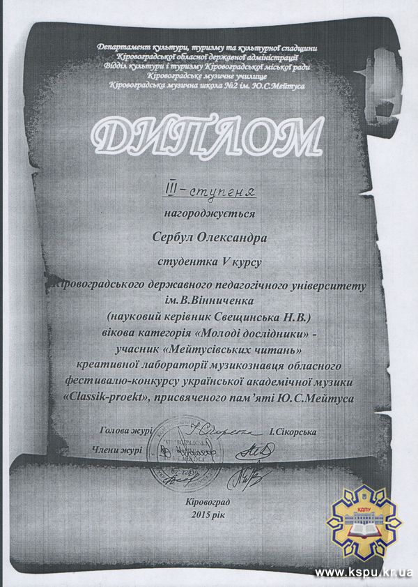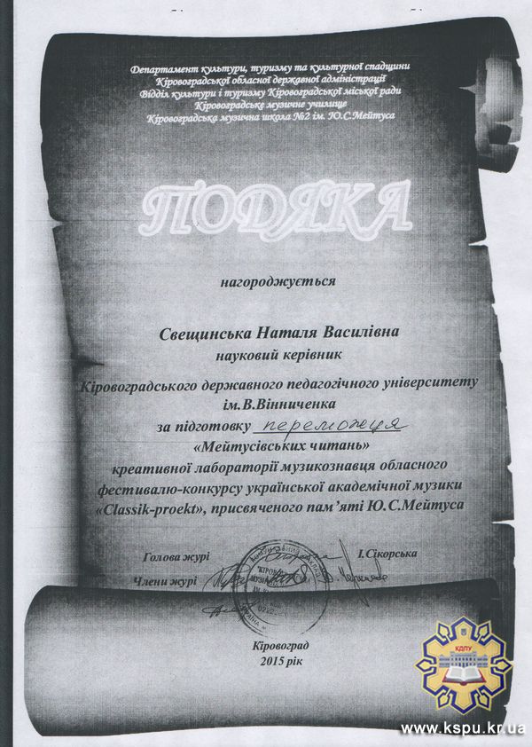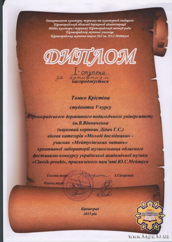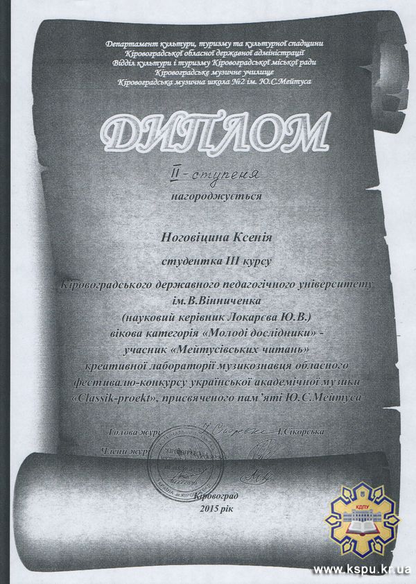 2015 рік розпочався на емоційній ноті. Щойно на базі Кіровоградської музичної школи №2 імені Ю.С. Мейтуса відбувся фестиваль української академічної музики «Klassik-proekt» присвячений пам’яті Юлия Сергійовича Мейтуса відомого композитора, який народився в місті Єлисоветграді. Цьогоріч цей захід став ще більш насиченим завдяки креативній лабораторії музикознавця, паралельно зякою проводилися змагання юних композиторів, конкурси на найкраще виконання творів Ю.С. Мейтуса, авторські концерти визначних українських композиторів сучасності, виступи учнів музичних шкіл та студентів мистецьких навчальних закладів, виставки, презентації нових творів.