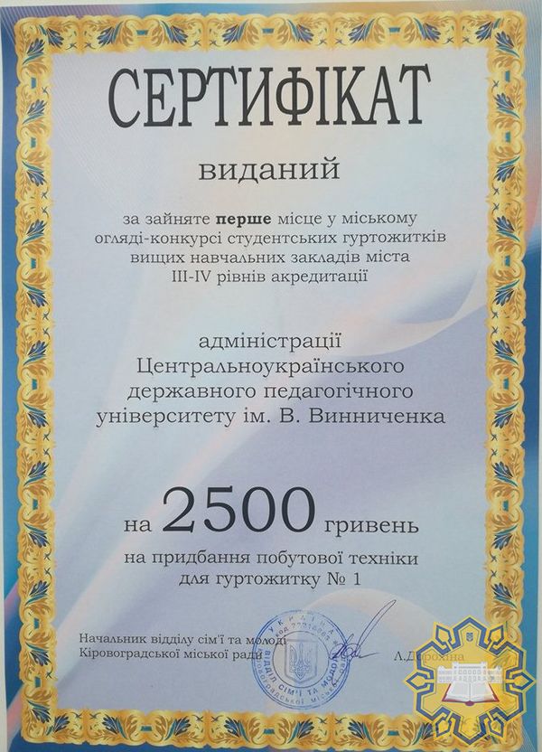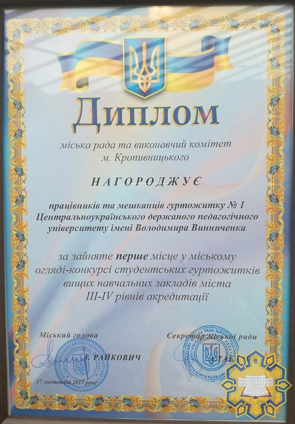 Студентське життя – це не тільки навчання, надбання професійних навичок, а й організований побут. З метою визначення кращої організації житлово-побутових умов для проживання, навчання та відпочинку студентської молоді у Кропивницькому було проведено огляд-конкурс на кращий студентський гуртожиток. Під час урочистого прийому, 17 листопада, з нагоди Міжнародного дня студента у міській раді Кропивницького, оголосили його результати і очільники міста вручити переможцям Сертифікати на придбання побутової техніки: