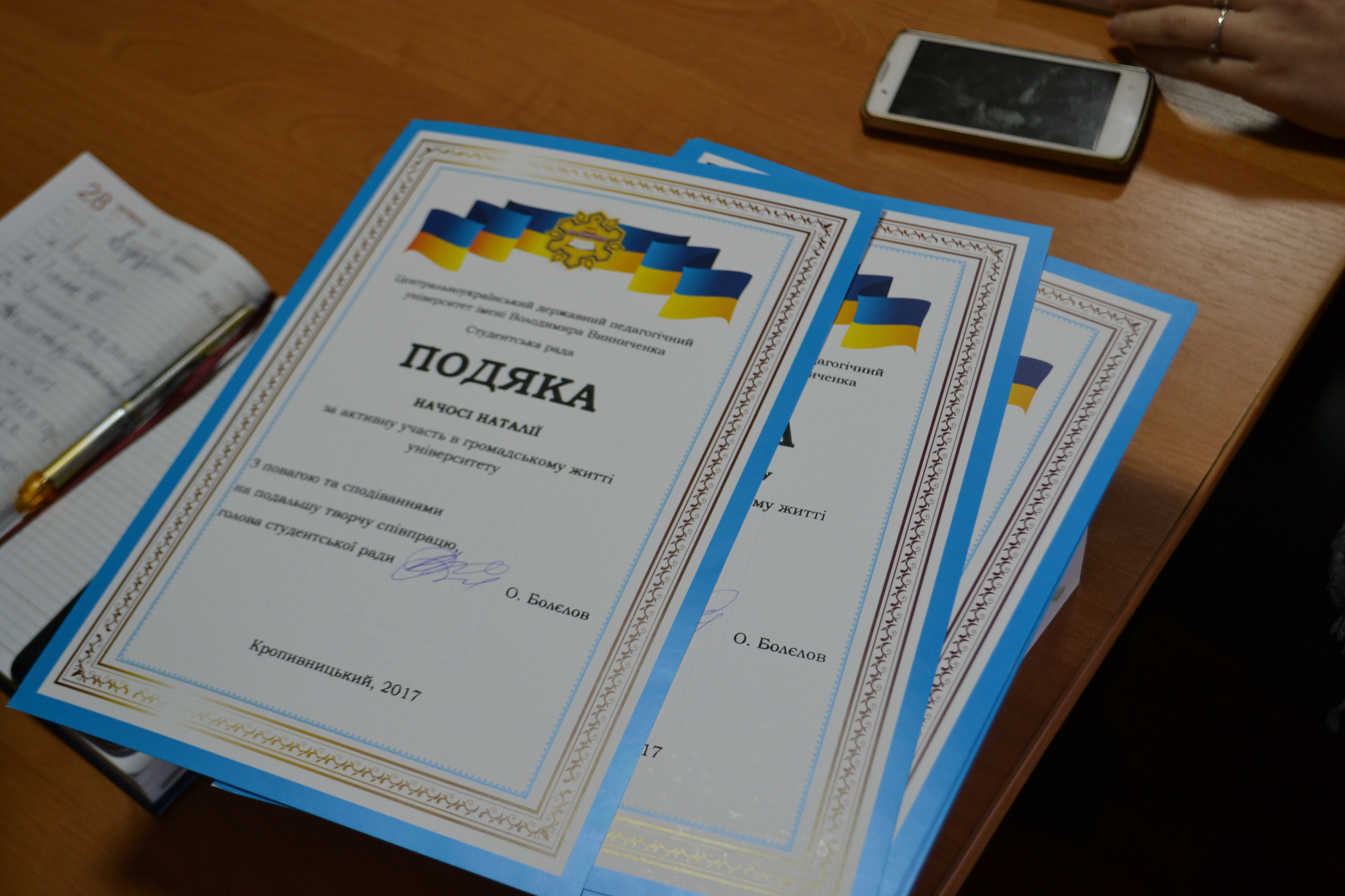 Тому для того, щоб правильно розпочати свою роботу, 29 листопада 2017 року, актив студентської ради зустрівся з ректором Центральноукраїнського державного педагогічного університету імені В.Винниченка Олегом Анатолійовичем Семенюком для планування подальшої роботи. Під час зустрічі студенти ставили питання про студентське життя і одразу ж могли отримати відповіді. Також ректор висловив своє бачення напрямків роботи студентського самоврядування та наголосив на об'єднанні зусиль для розвитку педагогічного закладу. У ході бесіди виокремили головні пункти подальшої співпраці: створення зон комфорту на факультетах, підтримку таких клубів як: “Що?Де?Коли?”, “КВК”, боротьбу з негативними звичками студентів та головні проекти для розвитку, але про це ви дізнаєтесь трохи пізніше. Окрім планового засідання, відбулося нагородження найактивніших членів студентських рад (за поданням студентських активів факультетів) минулого скликання. Подяки та цінні подарунки отримали: Стеба М., Гева Б., Войтенко Я., Стець Д., Максименко А., Начоса Н., Воєвода О., Москачук К. З погляду на сказане вище, залишається лише побажати студентському самоврядуванню розвитку та плідної праці.