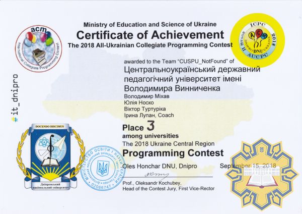 Студенти фізико-математичного факультету нашого університету вже не перший рік беруть участь у міжнародному командному чемпіонаті з програмування. 2016 року команда KSPU_NotFound була восьмою на ІІ етапі змагань. Торік на другому етапі успішно виступили вже дві команди – KSPU_HelloWorld стала дев’ятою, а KSPU_NotFound фінішувала дванадцятою. Але в жовтні 2017 року саме команда KSPU_NotFound у складі Юлії Носко, Віктора Туртуріки та Володимира Міхава стала призером ІІІ етапу Всеукраїнської студентської олімпіади з програмування.