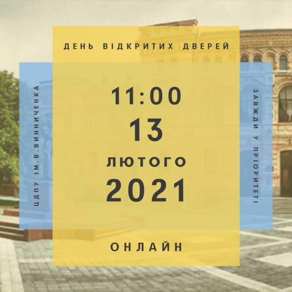 13 лютого 2021 року об 11:00 запрошуємо вступників на День відкритих дверей ЦДПУ ім. В. Винниченка, що відбуватиметься в онлайн-режимі.