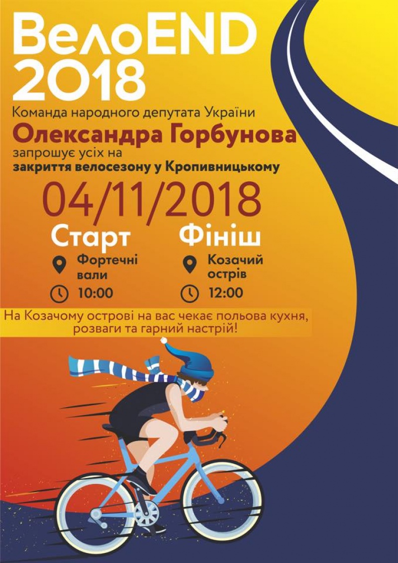 Найближчої неділі, 4 листопада, у Кропивницькому проведуть закриття велосезону, до участі в якому запрошують усіх охочих – як велосипедистів-професіоналів, так і любителів.