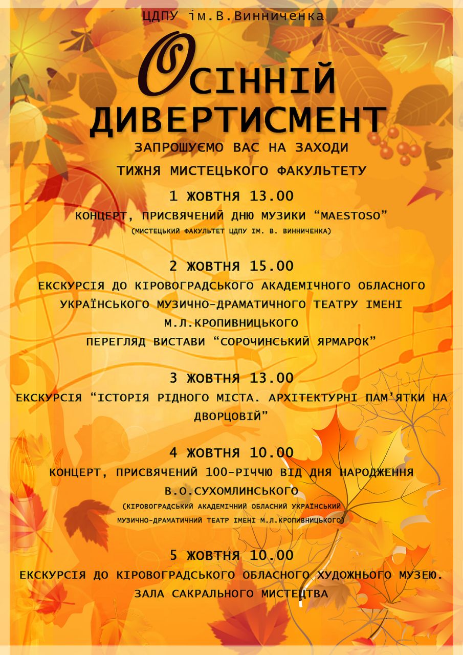 Осінь чарівна пора і дарує шанувальникам мистецтва різнобарв’я професійних свят – Міжнародний День Музики, День Художника, День Вчителя. Мистецький факультет ЦДПУ імені Володимира Винниченка з 1 по 5 жовтня традиційно проводить Тиждень факультету і запрошує всіх бажаючих на творчі заходи.