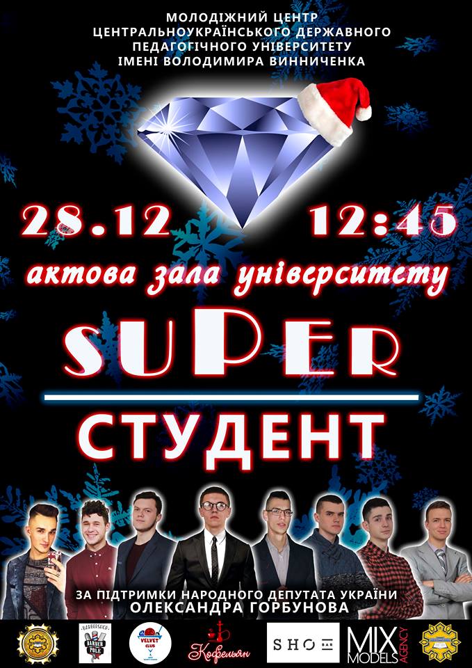 Обери свого Містера! 28 грудня в актовій залі Центральноукраїнського державного педагогічного університету імені В.Винниченка до новорічних свят відбудеться грандіозне шоу - “Містер університет!”. Несподівані конкурсні виходи, номери — це все підготували для Вас!