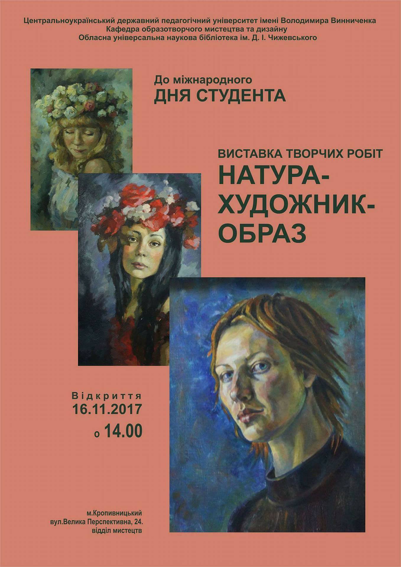 Шановні друзі! Запрошуємо вас на виставку «Натура-художник-образ», яка відкриється 16 листопада у відділі мистецтв ОУНБ iм. Д. I. Чижевського з нагоди Міжнародного дня студента.