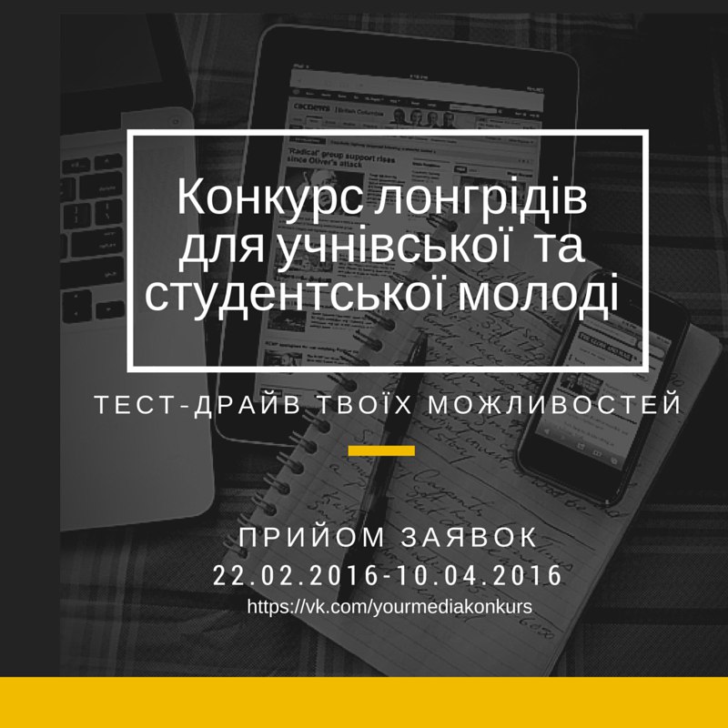 Факультет філології та журналістики Кіровоградського державного педагогічного університету імені Володимира Винниченка запрошує учнів ЗОШ І-ІІІ ступенів Кіровоградської області та студентів навчальних закладів Кіровоградської області взяти участь у Конкурсі лонгрідів для учнівської та студентської молоді «OPEN MEDIA SPACE». http://siteopenmediaspace.strikingly.com/