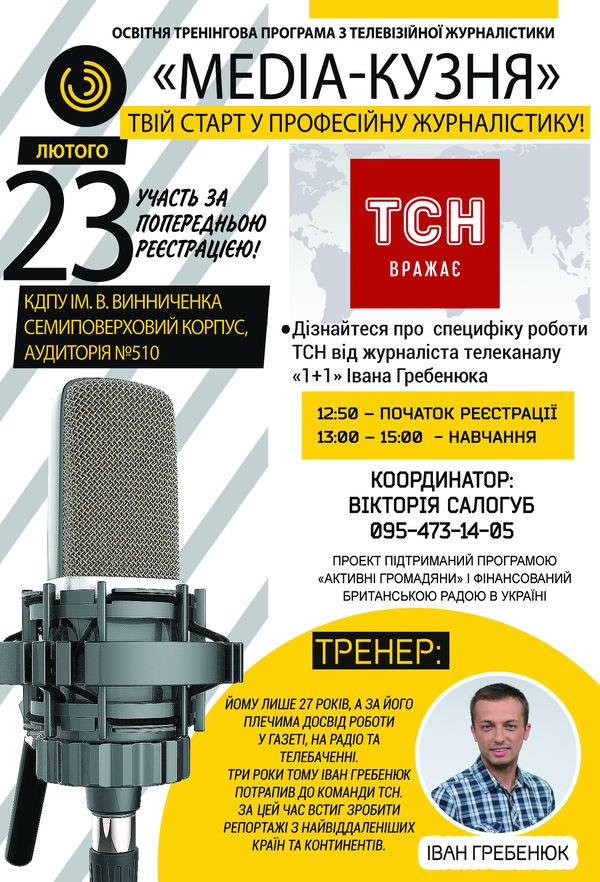 У рамках проекту «Media-кузня» 23 лютого до КДПУ ім. В. Винниченка завітає Іван Гребенюк – журналіст телевізійної служби новин телеканалу «1+1», який проведе майстер-клас для студентської молоді. Зустріч відбудеться в семиповерховому корпусі, 510 аудиторії. Участь у програмі за попередньою реєстрацією.