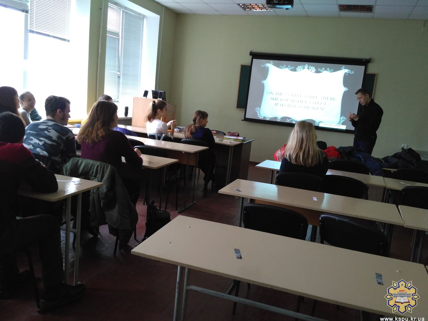 Саме у такій веселій, творчій, несерйозній атмосфері і відзначали своє професійне свято студенти 14 групи. На занятті з «Практики усного та писемного мовлення» (викладач – Чорна О.О.) вони розважались і жартували (звичайно ж у межах “English is spoken here”).