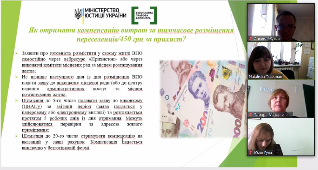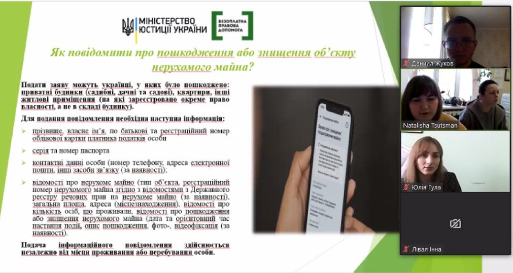 Під час заходу розглянули особливості правового статусу внутрішньопереміщених осіб, порядок оформлення цього статусу та державної підтримки. Приділили увагу також питанню фіксації воєнних злочинів та пошкодження чи знищення об’єктів нерухомого майна.