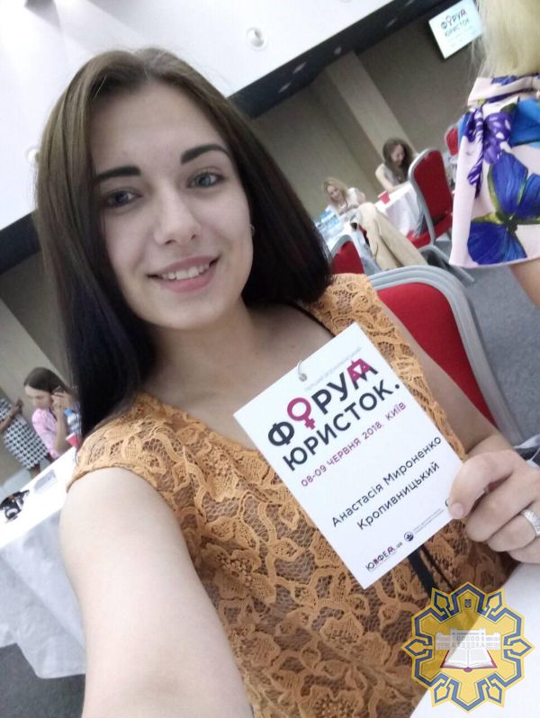 З 8 по 9 червня 2018 року в Києві стартував Перший Всеукраїнський Форум юристок, який відбувся вперше в історії юридичної професії України за участі 200 правниць. Серед яких були адвокатки, судді, нотаріуски, представниці правоохоронних органів, правозахисниці та інші фахівчині з галузі права, також приймала безпосередню участь студентка Центральноукраїнського державного педагогічного університету імені Володимира Винниченка магістр першого року навчання факультету історії та права спеціальності 081 Право, заступник начальника відділу представництва в Кропивницькому Місцевому центрі з надання безоплатної вторинної правової допомоги – Мироненко Анастасія.
