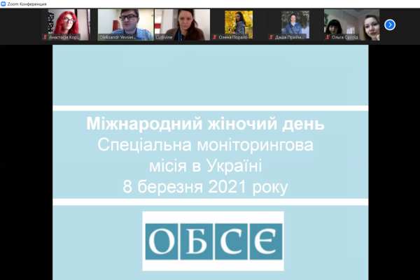 9 березня відбулася онлайн-презентація від представників Спеціальної Моніторингової Місії ОБСЄ Людівін Естьєн (спостерігачки Дніпровського офісу СММ ОБСЄ, координаторки СММ ОБСЄ з питань ґендерної рівності) та Анни Фесенко (старшої асистентки відділу преси і публічної інформації СММ ОБСЄ), присвячена Міжнародному Жіночому Дню та зв’язку між гендерною рівністю та участю жінок в становленні миру.