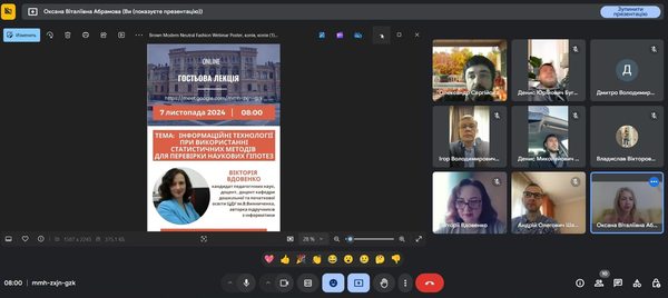7 листопада 2024 року в рамках посилення підготовки здобувачів третього (освітньо-наукового) рівня Центральноукраїнського державного університету імені Володимира Винниченка відбулася гостьова лекція на тему «Інформаційні технології при використанні статистичних методів для перевірки наукових гіпотез», лекторка – Вдовенко Вікторія Віталіївна, авторка підручників з інформатики, фахівець із математичних методів дослідження, кандидат педагогічних наук, доцент кафедри дошкільної та початкової освіти ЦДУ ім. В. Винниченка.