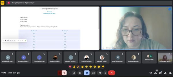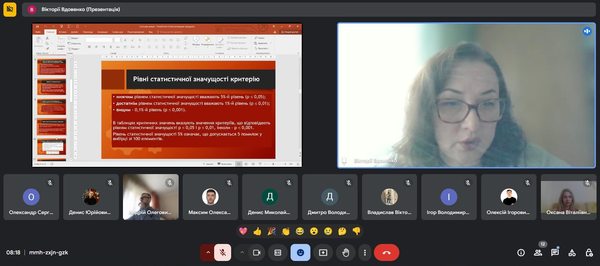 Під час заходу Вікторія Вдовенко ознайомила аспірантів із поняттям та роллю статистичних гіпотез у дослідженнях, принципами їх перевірки за допомогою статистичних критеріїв, зокрема критерію Стьюдента. Лекторка детально розглянула правила інтерпретації результатів дослідження й навела практичні приклади застосування онлайн-інструментів для перевірки наукових гіпотез у дослідженнях.