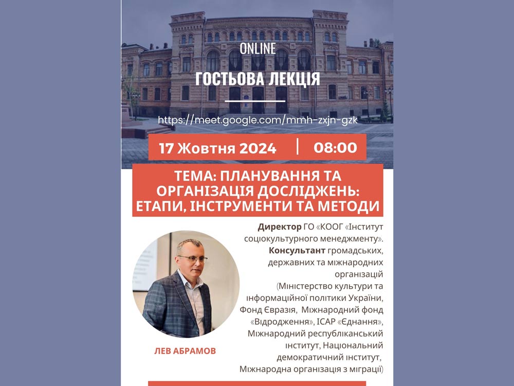 17 жовтня 2024 року в онлайн-форматі відбулася гостьова лекція на тему «Планування та організація досліджень: етапи, інструменти та методи» в межах викладання освітнього компоненту «Інформаційні технології в науці», яка є нормативною для здобувачів третього (освітньо-наукового) рівня вищої освіти Центральноукраїнського державного університету імені Володимира Винниченка. Під час лекції аспіранти ознайомилися з особливостями планування та проведення досліджень. Гостьовим лектором виступив випускник нашого університету Лев Абрамов – директор ГО «КООГ «Інститут соціокультурного менеджменту», тренер, експерт із організаційного розвитку та досліджень із 25-річним досвідом роботи, консультант низки громадських, державних та міжнародних організацій.