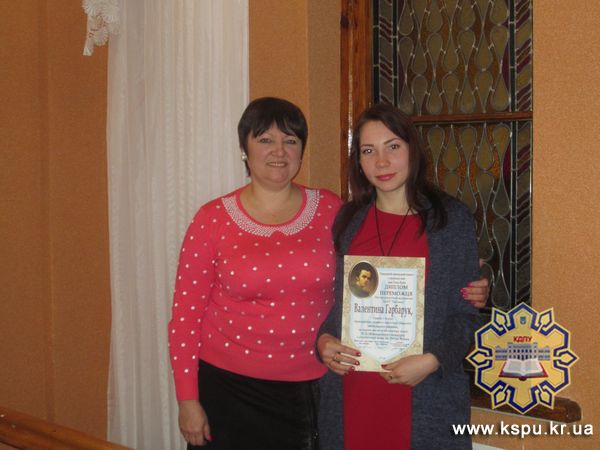 Кафедра української мови щиро вітає студентку V курсу факультету філології та журналістики нашого університету Валентину Гарбарук із заслуженою перемогою (науковий керівник професор С. Л. Ковтюх). Зичимо щастя, здоров’я, нових творчих злетів та досягнень на філологічній ниві. Валентина – гордість нашого факультету, неодноразовий учасник і переможець низки мовознавчих конкурсів та олімпіад.
