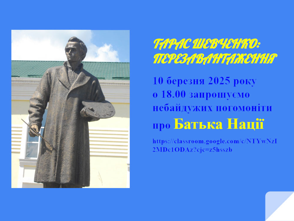 У понеділок, 10 березня 2025 року, о 18:00 у гугл-класі "ЗАХОДИ ЦДУ імені Володимира Винниченка" відбудеться показове засідання лінгвістичного гуртка "Тарас Шевченко: перезавантаження".