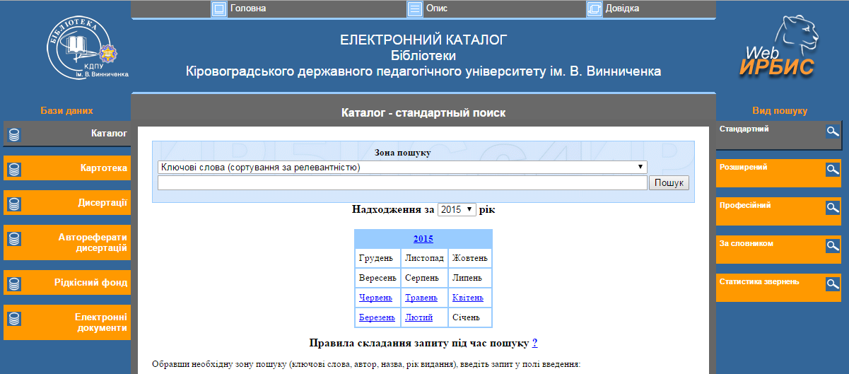 Розширений пошук здійснюють за ключовими словами, враховуючи усікання та логічні оператори, а також можливість уточнити запит, указавши тематику пошукового терміну, автора, вид та рік видання.