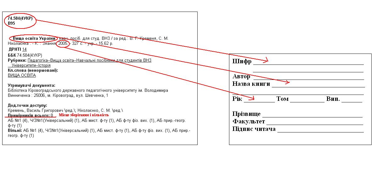 - Якщо книга має більше трьох авторів або на титульній сторінці видання не зазначено автора, картку потрібно шукати за назвою видання.