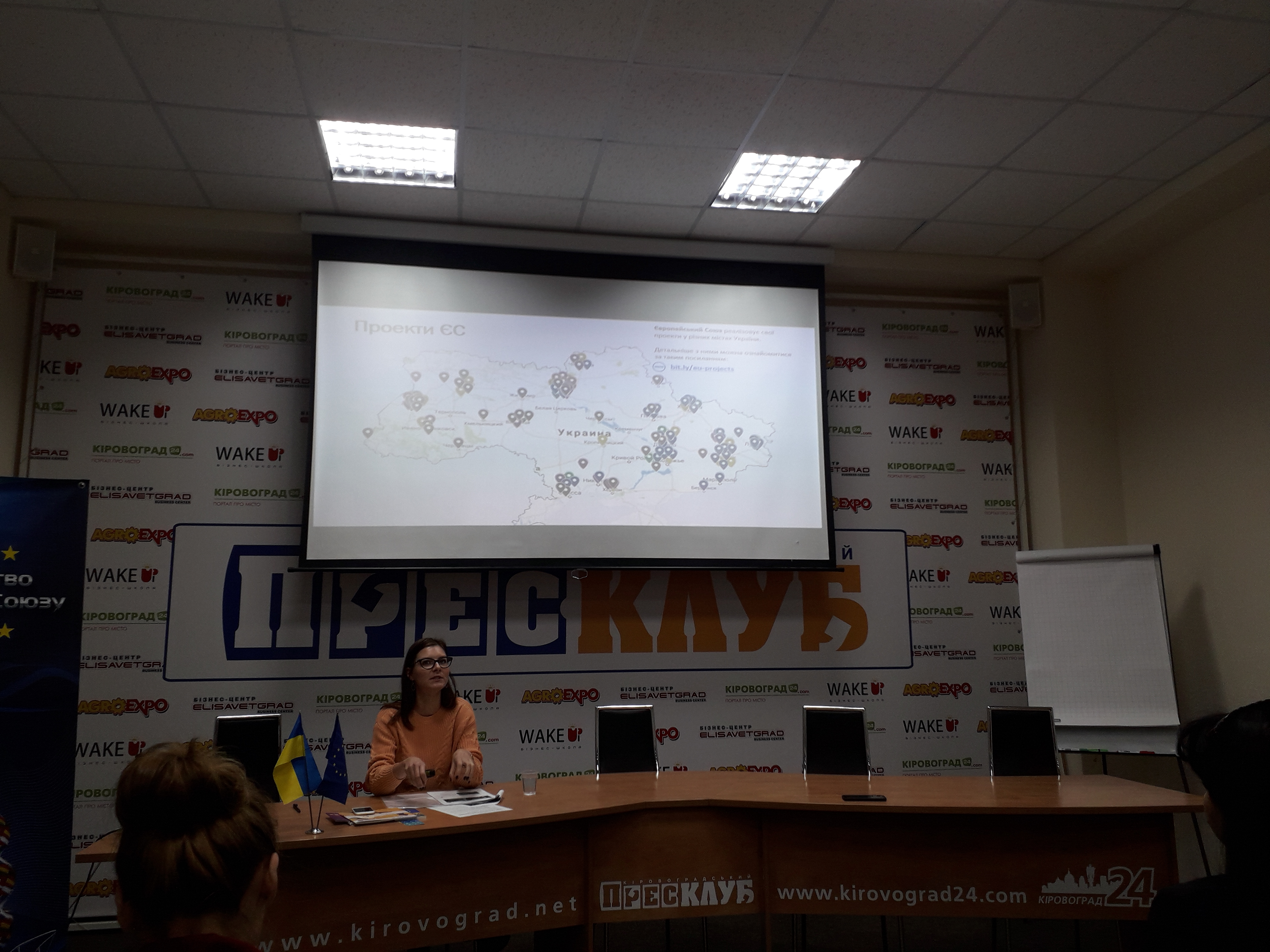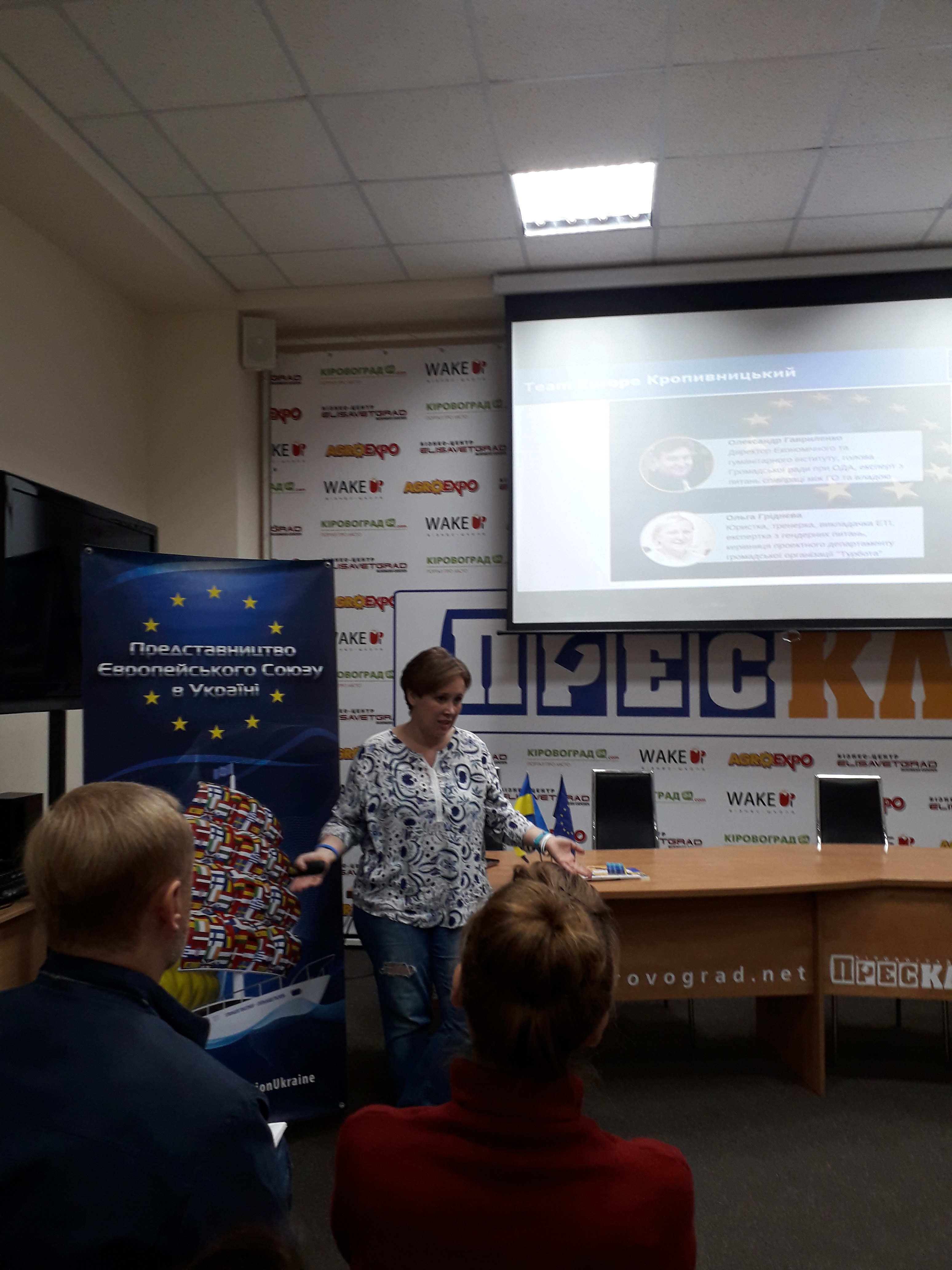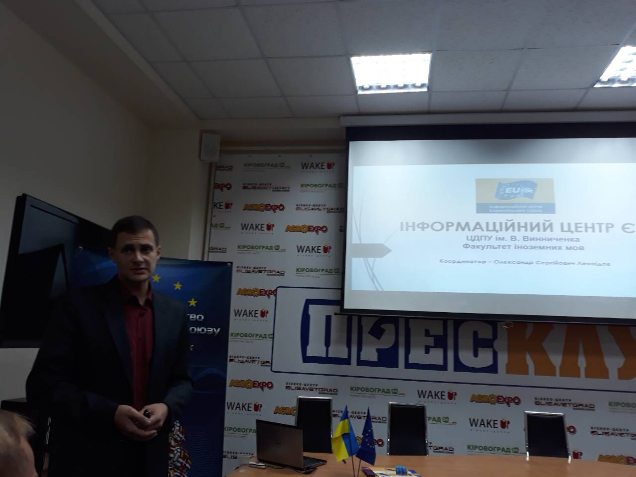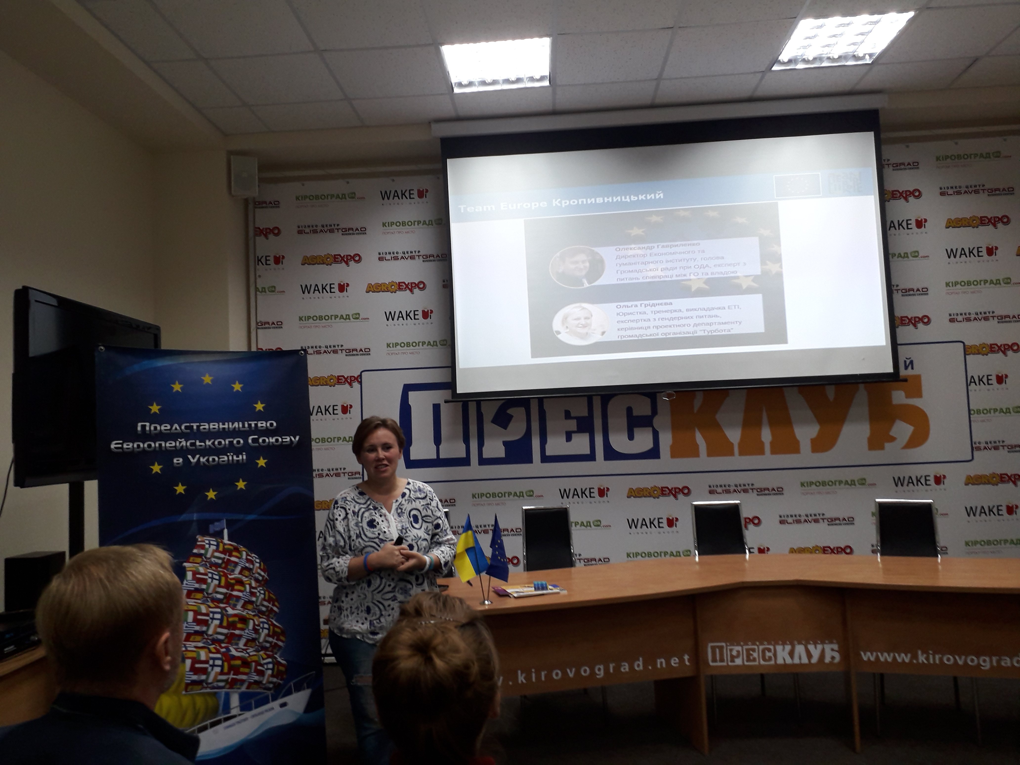 08 жовтня до «Прес-клубу реформ» з презентацією відкритих конкурсів на гранти та проекти ЄС завітала делегація Представництва ЄС в Україні. На заході були присутні представники органів місцевого самоврядування, державних та неурядових організацій, які отримали інформацію про можливості співпраці з ЄС. Особливу увагу було приділено довготривалим освітнім, молодіжним, культурним та бізнесовим програмам та проектам Євросоюзу, зокрема Horizon 2020, Creative Europe, Culture Bridges, Erasmus+, EU Study Days, COSME, EU4Business та ін. Під час заходу мали змогу виступити дідерка експертної ініціативи Представництва ЄС Team Europe Кропивницький Вікторія Талашкевич та координатор Інформаційного центру ЄС при Центральноукраїнському державному педагогічному університеті імені Володимира Винниченка Олександр Леонідов.