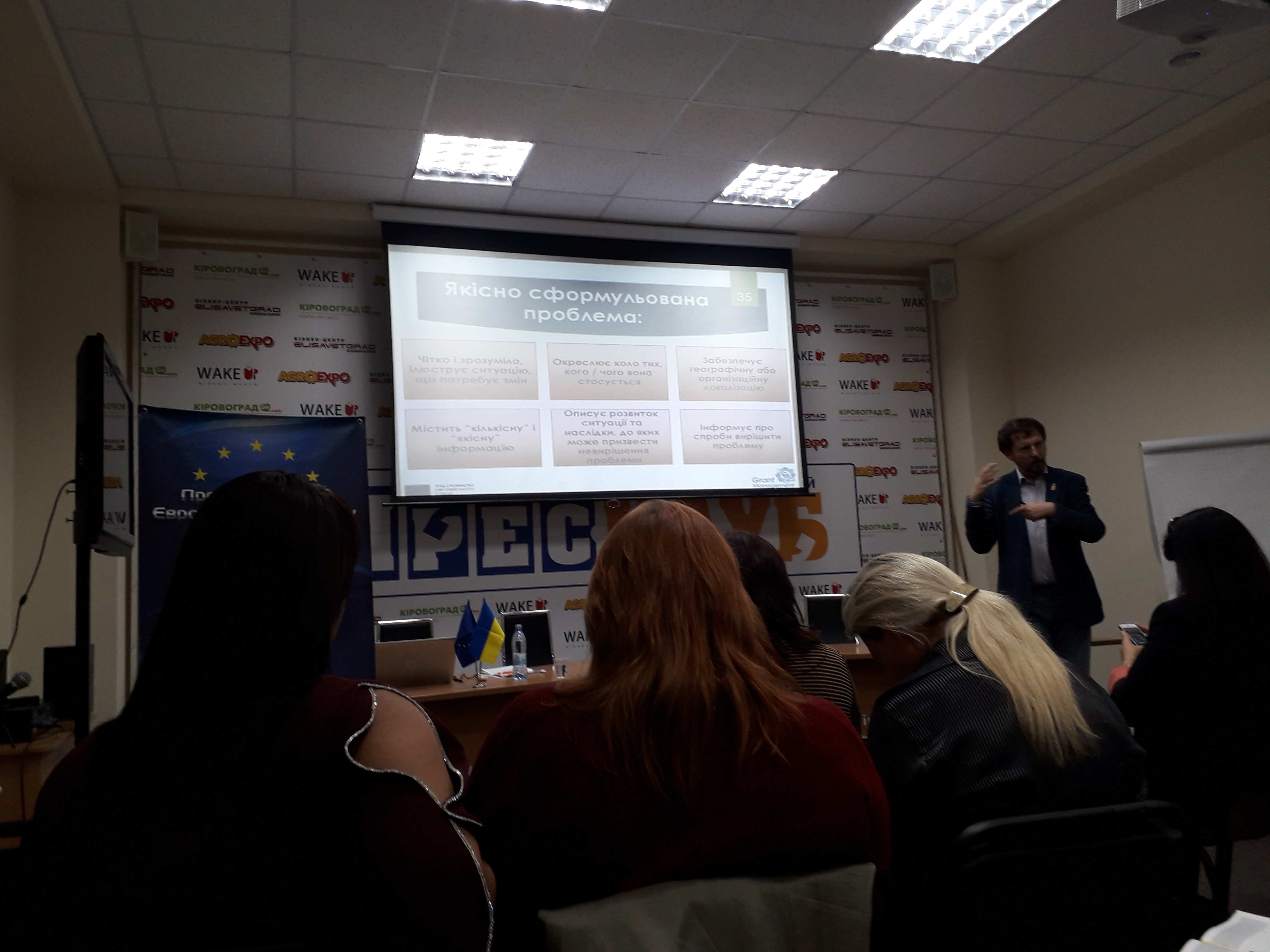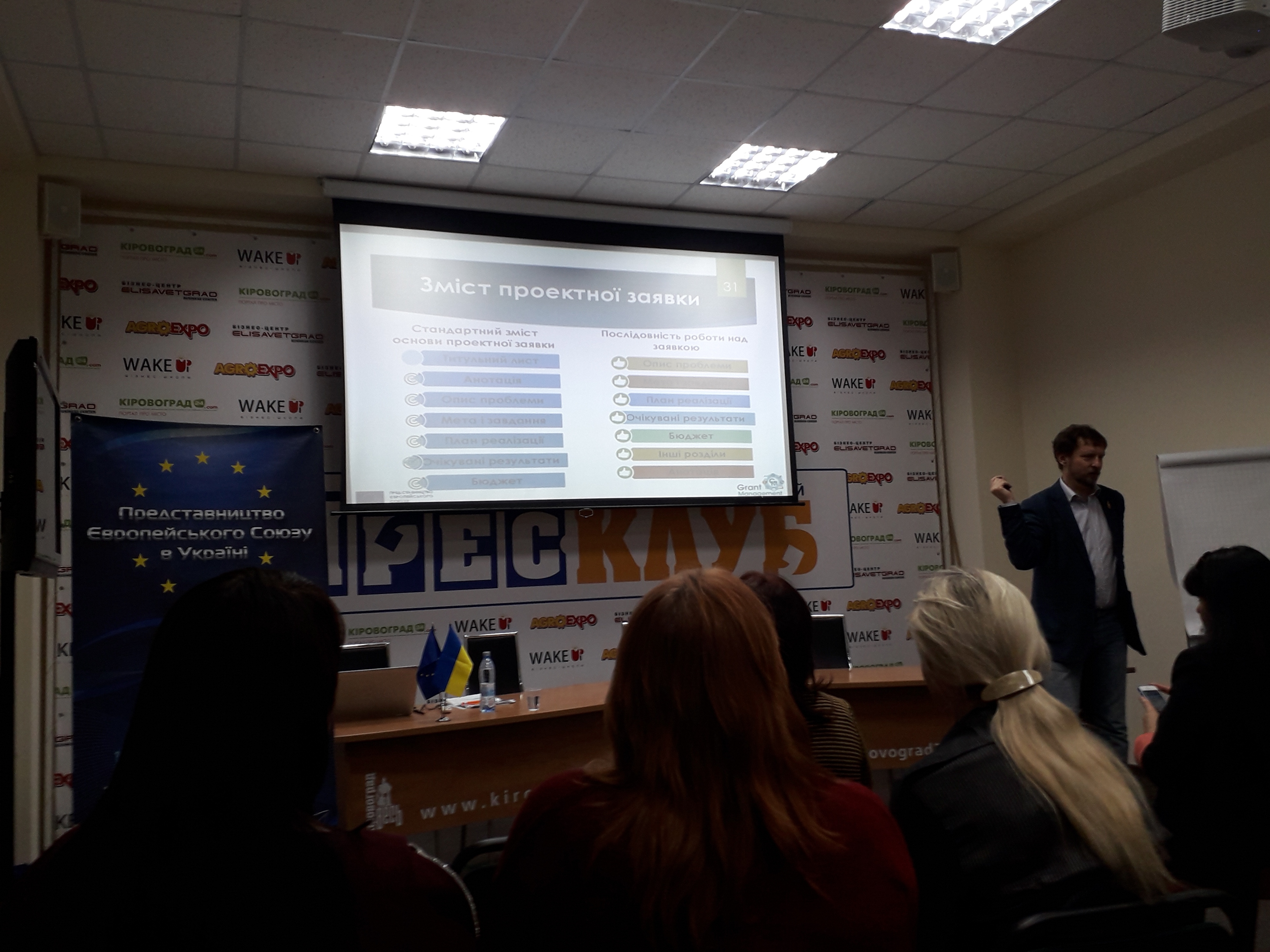 Президентові України, керівник проектів ГО «Інститут соціальної політики регіону». Тренінг покликаний допомогти громадським організаціям розвинути навички підготовки грантових заявок на конкурси і тендери ЄС і комунікації з донорами. На реальних прикладах було розглянуто питання термінології грантових заявок і тендерів; принципів ефективної комунікації з донорами; видів грантової допомоги; написання грантової заявки; складання бюджету проекту та ін.
