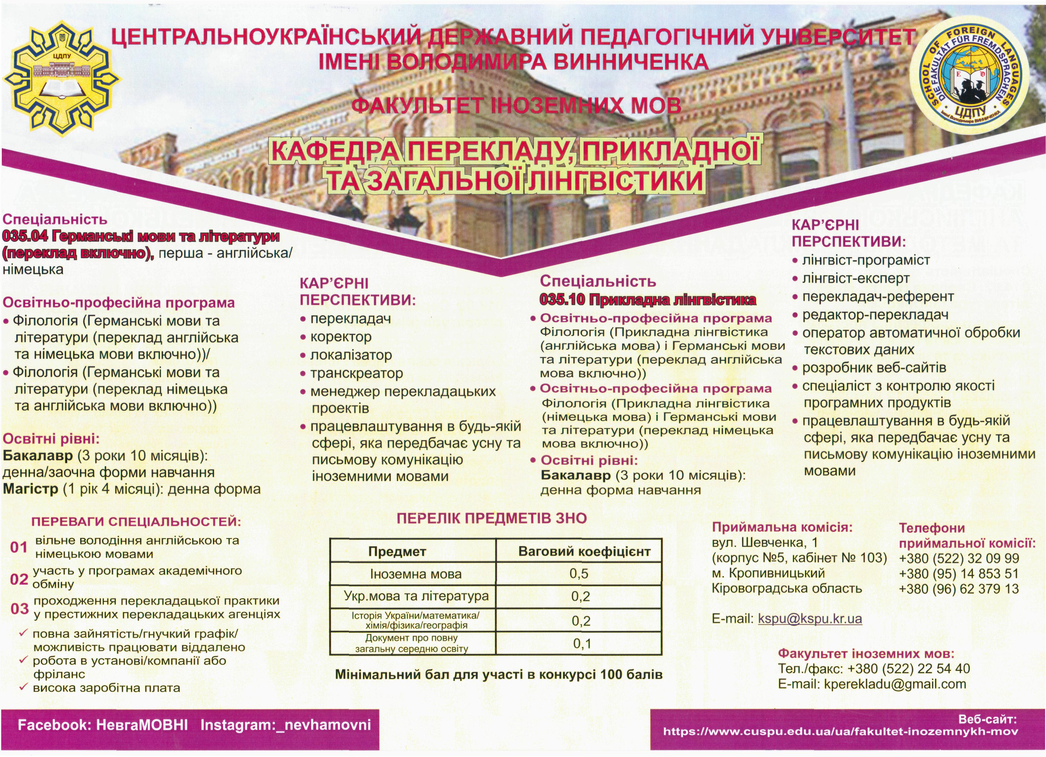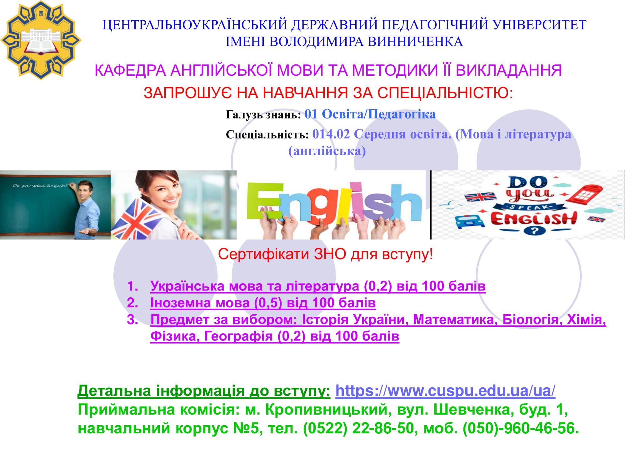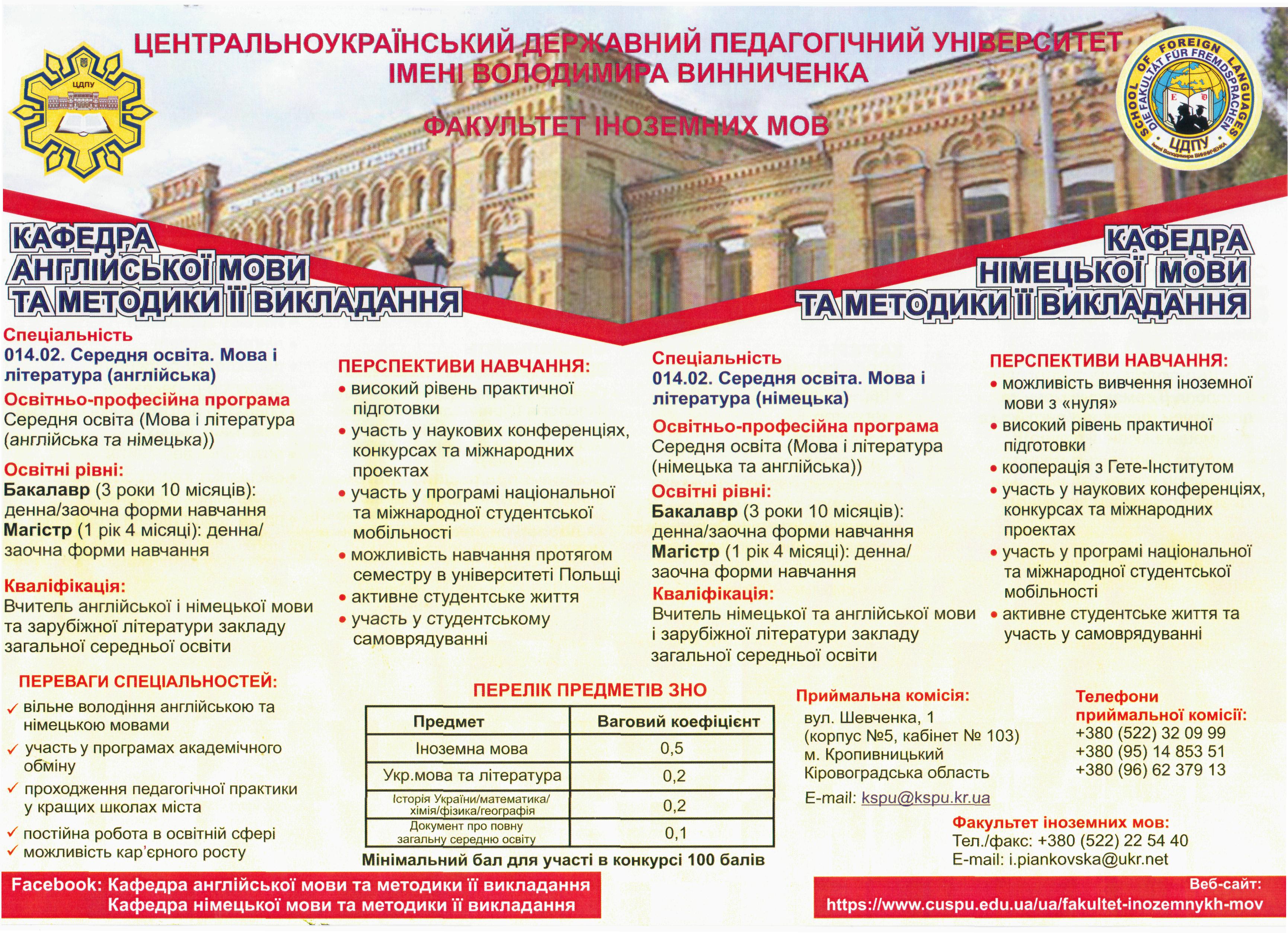 Факультет іноземних мов Центральноукраїнського державного педагогічного університету імені В. Винниченка запрошує на навчання активних, креативних та творчих студентів.