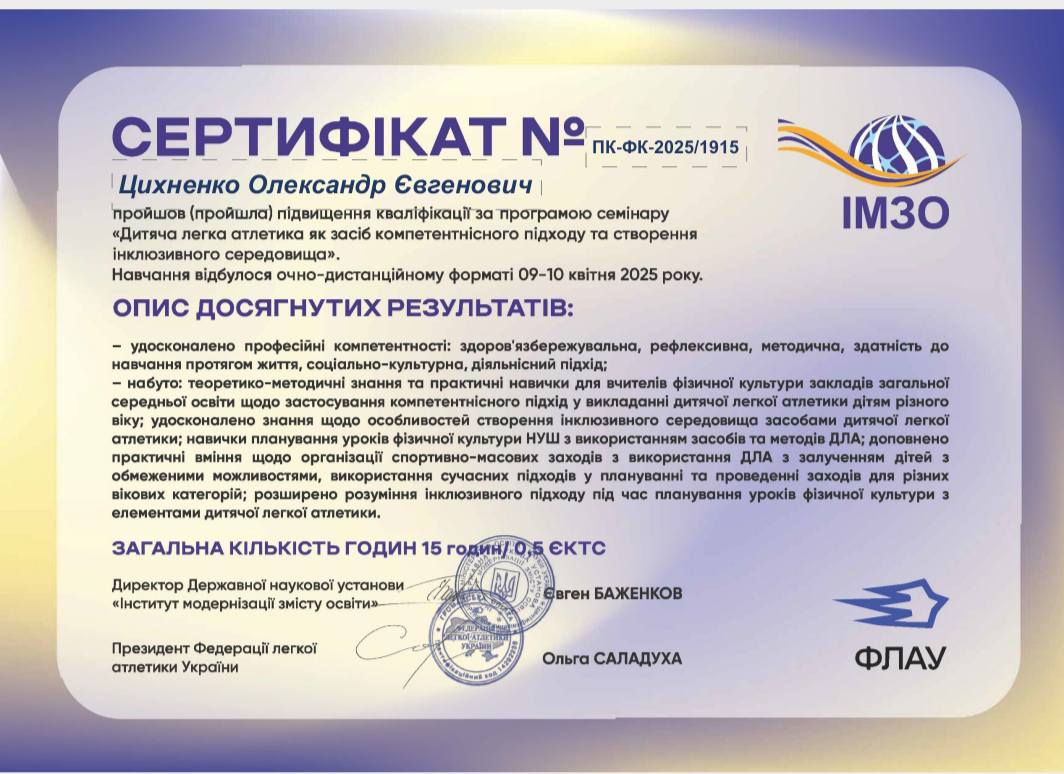 Маленюк Тетяна доцент кафедри ТМ олімпійського і професійного спорту разом зі студентами спеціальності 014.11 Середня освіта (Фізична культура): Цихненко О., Дубров В., Ковальчук О., Кишлян Є., Сізов А. у межах вивчення дисципліни "Теорія і методика викладання легкої атлетики", долучились до заходу. Студенти мали можливість розширити не лише теоретичні знання про модуль "Дитяча легка атлетика", але й ознайомитися з особливостями використання інвентарю, впровадження різних варіантів вправ тощо.