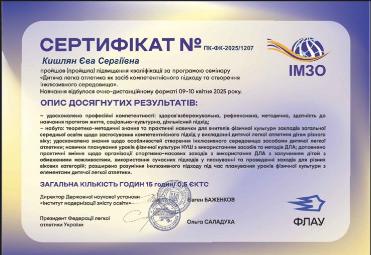 Семінар організовано Федерацією легкої атлетики України та Державною науковою установю "Інститут модернізації змісту освіти". Ліана Копилова спікерка семінару поділилась власним досвідом впровадження дитячої легкої атлетики на уроках фізичної культури.