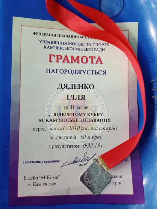 Студент першого (бакалаврського) рівня вищої освіти спеціальності А7 Фізична культура і спорт факультету фізичного виховання ЦДУ ім. Володимира Винниченка Ілля Дяденко здобув ІІ місце у Відкритому кубку м. Кам’янське з плавання (17 травня 2025 року) на дистанції 50 м брасом!