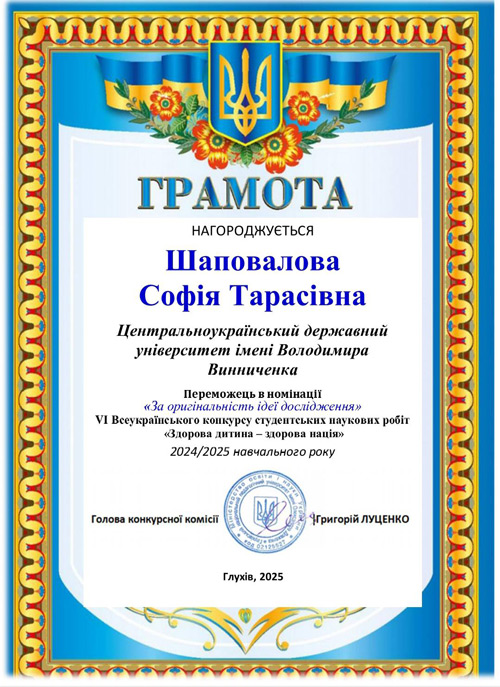 Шаповалова Софія, магістрантка факультету фізичного виховання стала переможцем у номінації "За оригінальність ідеї дослідження" VI Всеукраїнського конкурсу студентських наукових робіт "Здорова дитина - здорова нація".