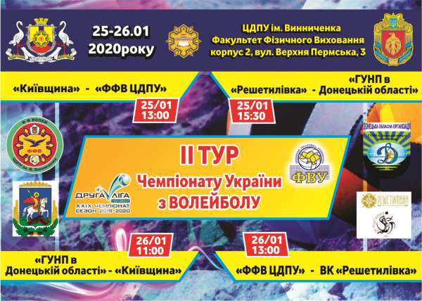 Найближчими вихідними, 25-26 січня, до факультету фізичного виховання завітають учасники ІІ туру чемпіонату України з волейболу класичного, друга ліга. Нагадуємо що кожного року наш університет гостинно приймає домашній тур, у якому беруть участь чотири команди, а загалом у нашій підгрупі грає вісім команд.