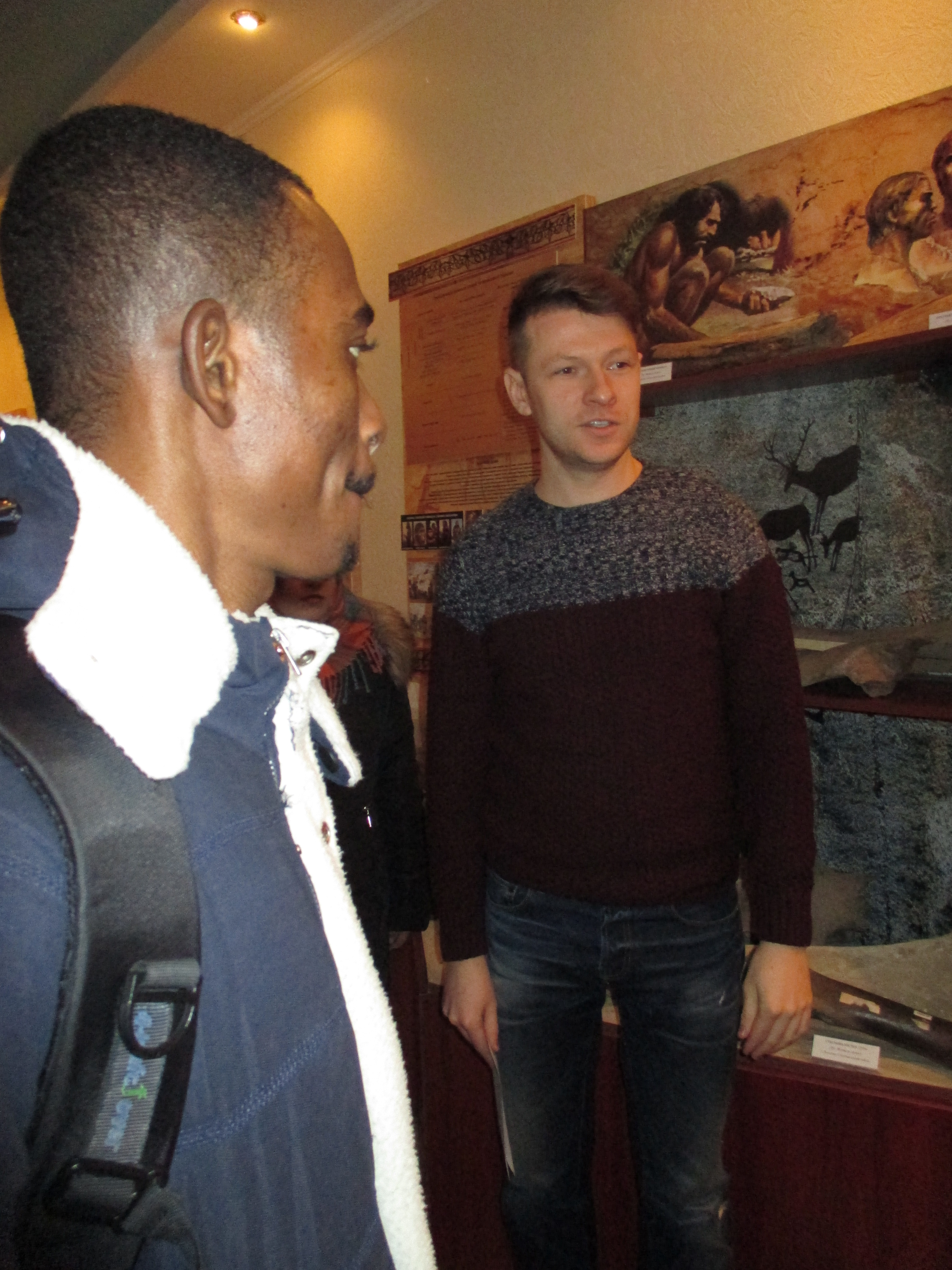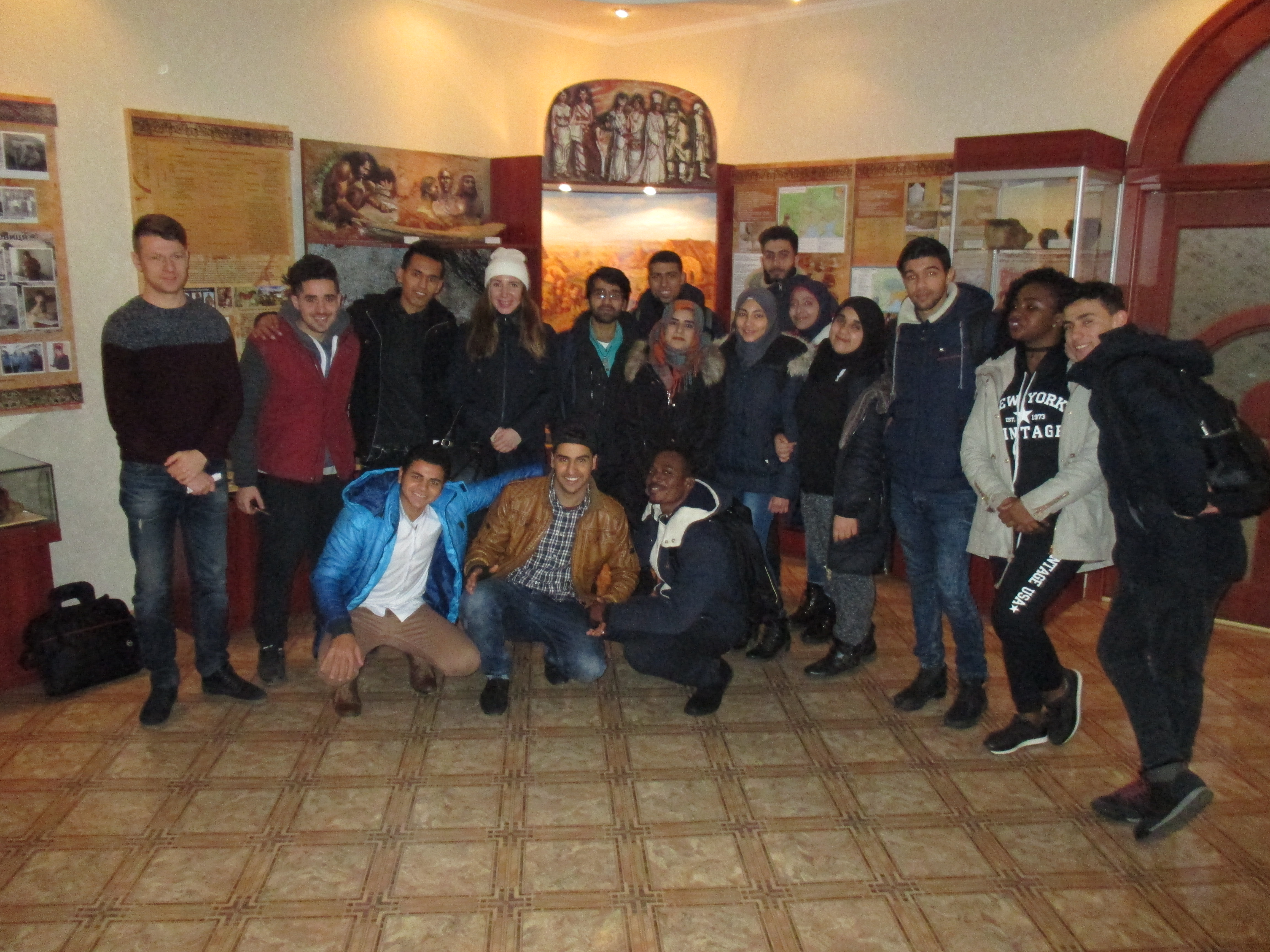 В археологічному музеї нас гостинно зустрів викладач кафедри історії України К. Панченко. Під час екскурсії студенти коротко ознайомилися з експозицією музею та історією нашого регіону. По завершенню розповіді студенти змогли отримати відповіді на свої питання. Спеціально для майбутніх медиків К. Панченко дозволив оглянути і сфотографувати знайдений на розкопках людський череп зі слідами трепанації. Наздвичайно приємно було бачити як студенти наввипередки поспішали записати свої враження до книги відгуків (арабською та англійською мовами). Було неочікувано та приємно почути від студента з Єгипту, що коли він вивчить українську мову – то буде розмовляти лише українською.