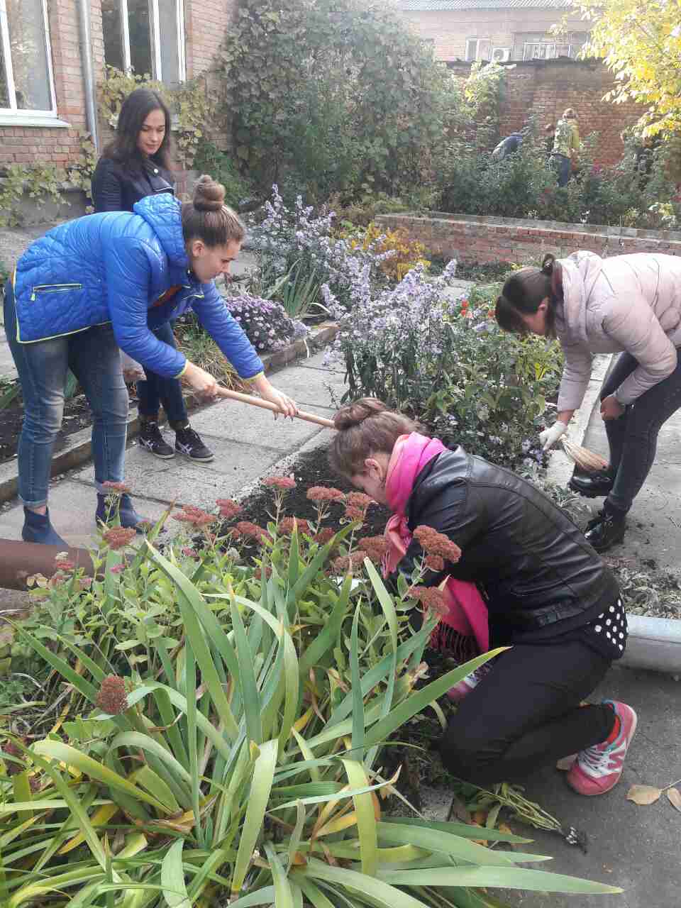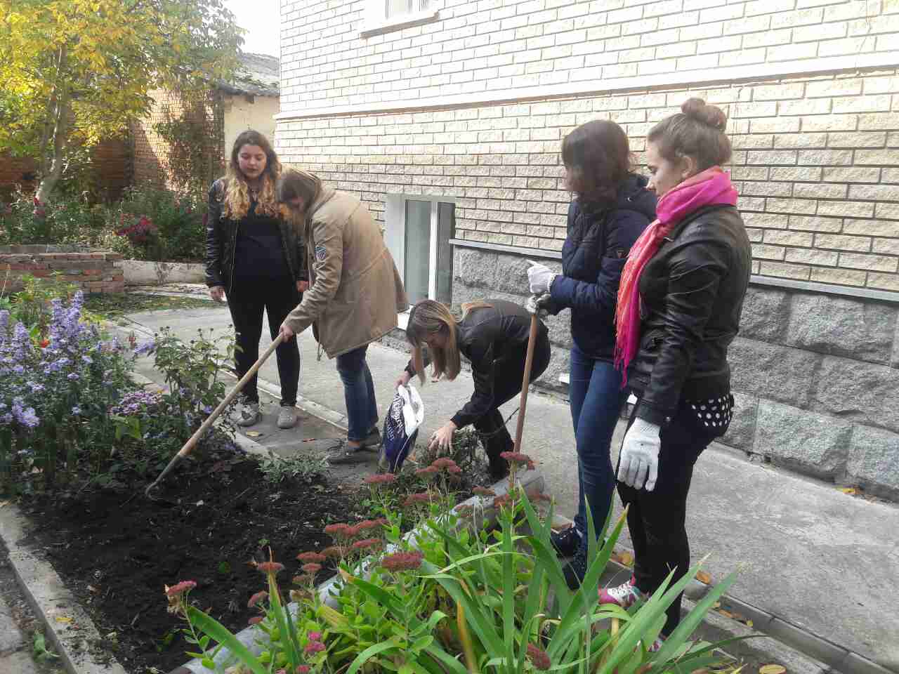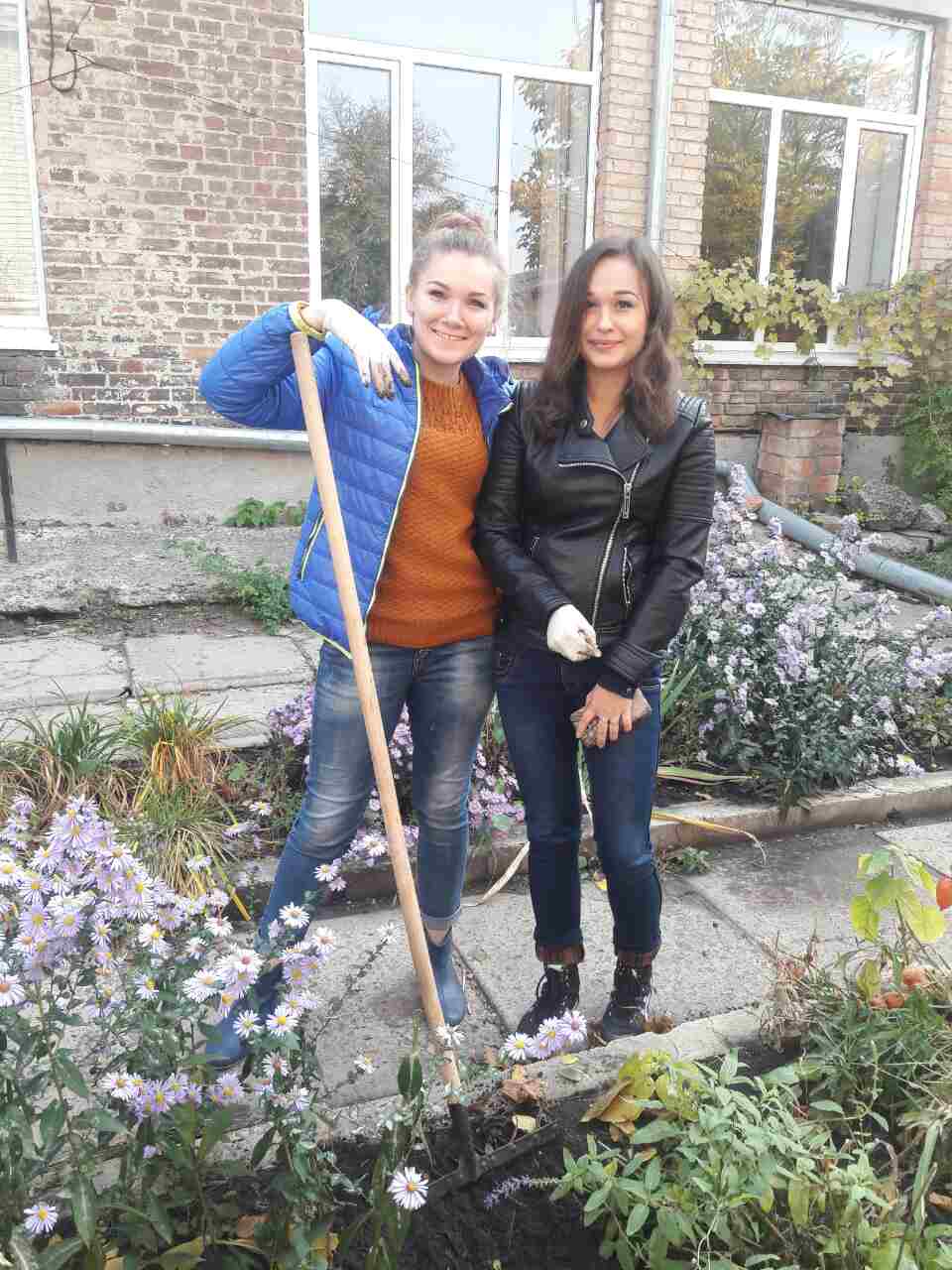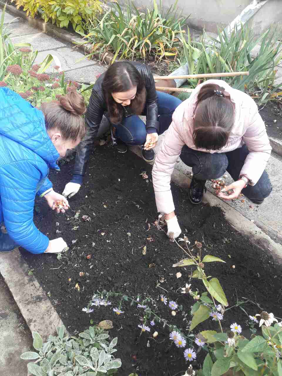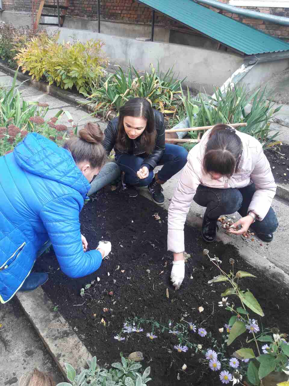 Тож 18 жовтня студенти кафедри біології на чолі з Дефорж Ганною Володимирівною та Калініченко Надією Андрієвною вирішили подарувати цю окрасу і нашій кафедрі, озеленивши ділянки її різними рослинами . В наступному році ми всі зможемо спостерігати цвітіння квіткових композицій, створених руками наших студентів. Було посаджено розмаїття цибулевих та лілейних квітів. Оновлена алея із різнокольорових хризантем. Восени ми завжди зможемо спостерігати квітучу барвистість морозу, посадженого біля кремезного горіха.