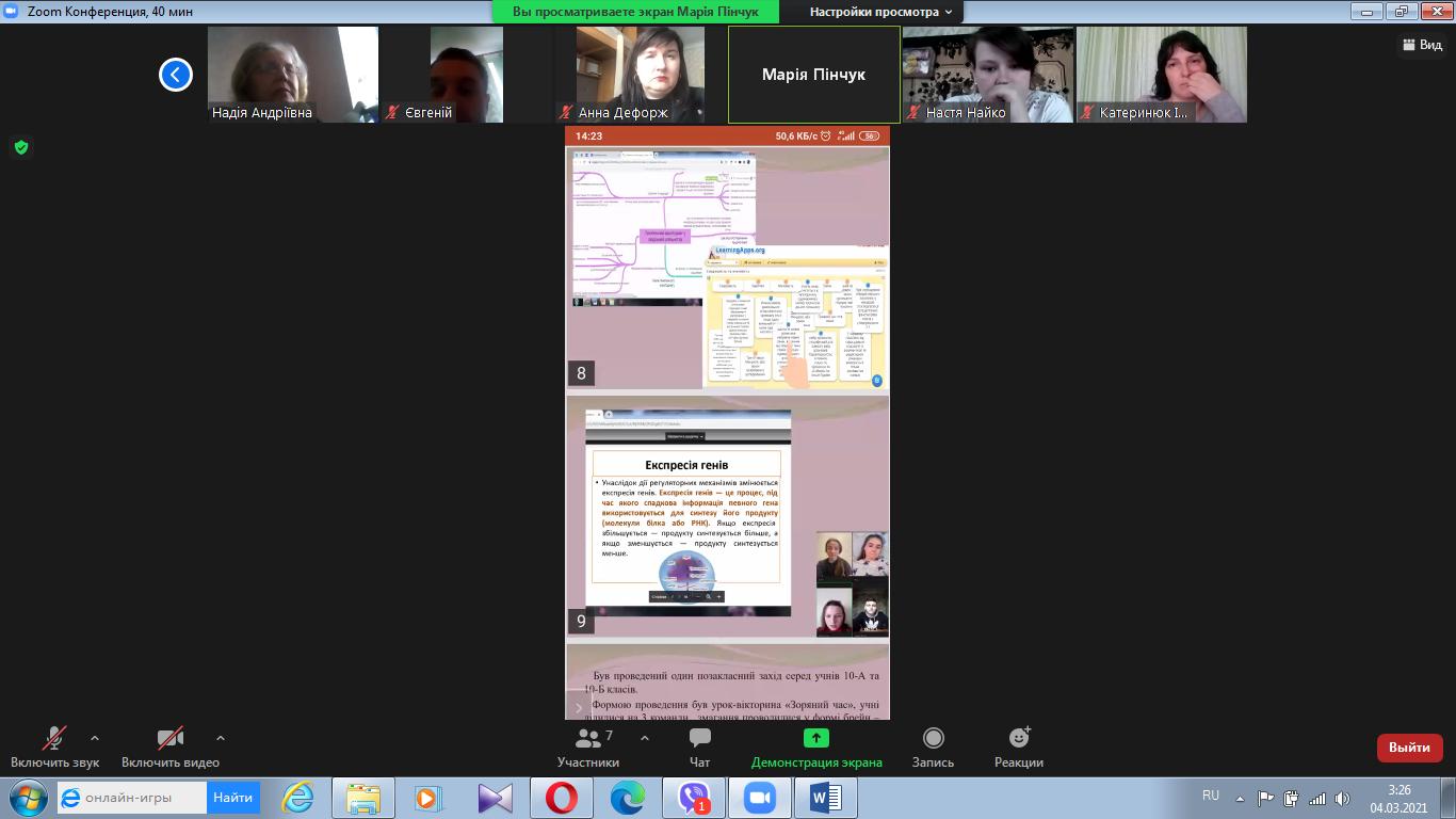 5 березня 2021 року в режимі Zoom-конференції за участі студентів магістрів першого року навчання заочної та денної форми, методистів з біології Н.А. Калініченко та Г.В. Дефорж а також заступника декана з навчально-методичної роботи ПГФ Н.М. Маслової, було проведено звітну конференцію із проходження педагогічної практики.
