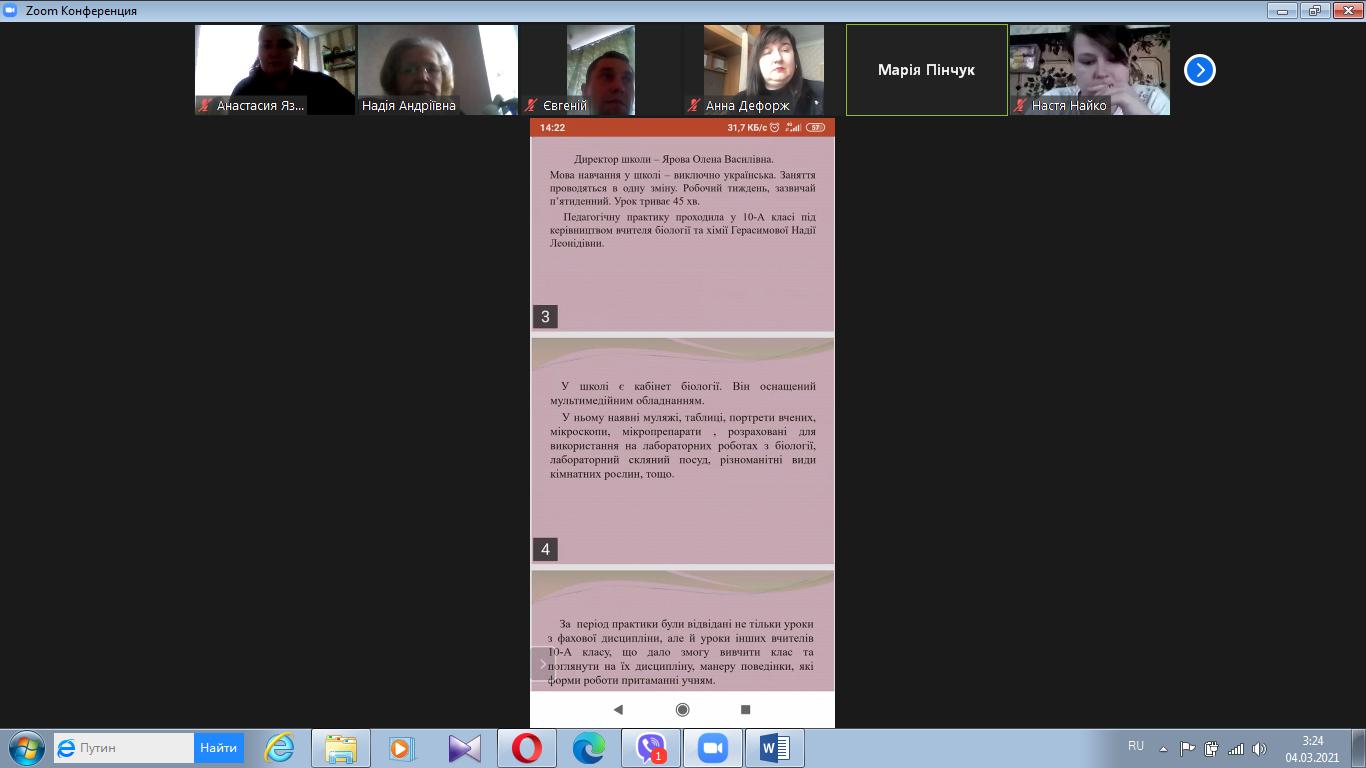 5 березня 2021 року в режимі Zoom-конференції за участі студентів магістрів першого року навчання заочної та денної форми, методистів з біології Н.А. Калініченко та Г.В. Дефорж а також заступника декана з навчально-методичної роботи ПГФ Н.М. Маслової, було проведено звітну конференцію із проходження педагогічної практики.