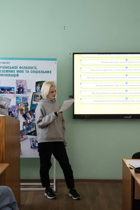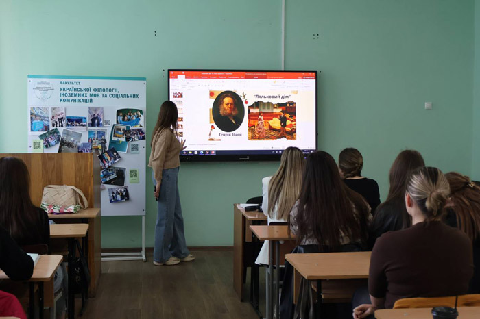 Напередодні тижня факультету української філології, іноземних мов та соціальних комунікацій та дня самоврядування, на кафедрі германських мов, зарубіжної літератури та методик їхнього навчання проведено заняття, де самі студенти керували навчальним процесом. 29 квітня Дар’я Літвінчук, студентка групи АН21Б, креативно, цікаво й професійно провела заняття із зарубіжної літератури для студентів інших курсів - групам  УА21Б, АН22Б та АН24Б. Це заняття стало глибокою розмовою про рівність, вибір і право бути почутим. У центрі — п’єса Генріка Ібсена «Ляльковий дім» — не просто літературний твір, а голос за рівність, що й сьогодні звучить по-особливому гостро.
