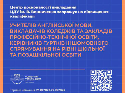 На кафедрі германських мов, зарубіжної літератури та методик їхнього навчання продовжують роботу курси підвищення кваліфікації вчителів англійської мови (ліцензія 19.05.2022, наказ МОН України №85-л від 23.05.2022).
