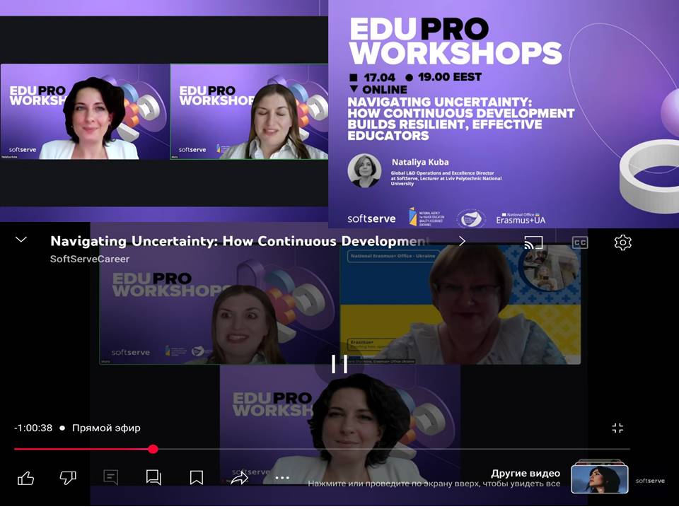 В період з 20 березня по 17 квітня 2025 року к.е.н., викладачі кафедри менеджменту та підприємництва Центральноукраїнського державного університету імені Володимира Винниченка - доцент Бондар Юлія Анатоліївна та к.пед.н., доцент Щоголєва Інна Валентинівна взяли активну участь у серії безкоштовних онлайн-воркшопів «Покращуй свої Soft Skills», що були організовані в межах освітньої програми EDUPRO спільно з компанією SoftServe.
