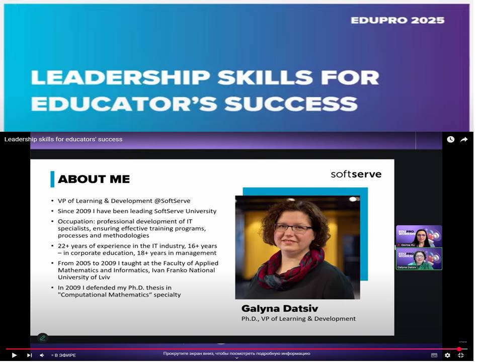 Спікер: Галина Даців, Ph.D., віце-президент з навчання та розвитку компанії SoftServe. У фокусі – ключові лідерські якості, необхідні для ефективної освітньої взаємодії та мотивації студентів.