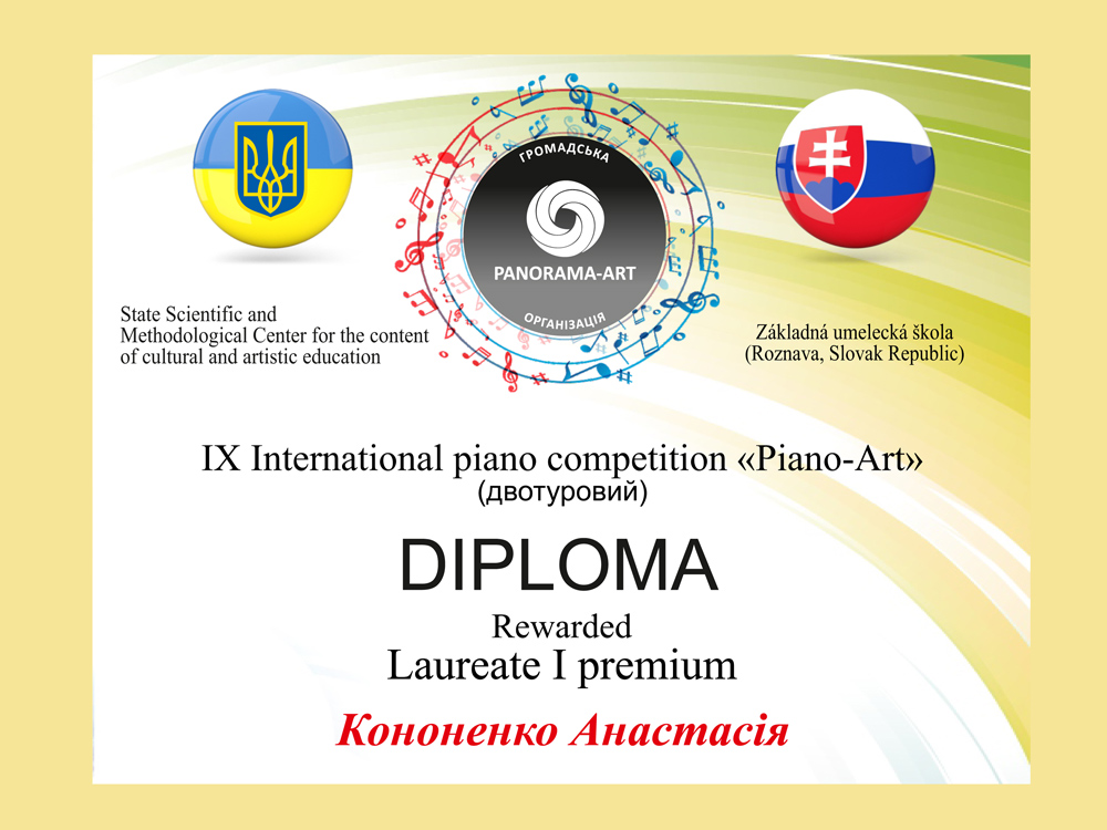 Вітаємо здобувачку освіти другого (магістерського) рівня вищої освіти факультету педагогіки, психології та мистецтв, спеціальність 014 Середня освіта, освітня програма Середня освіта (Музичне мистецтво)Кононенко Анастасію (клас кандидата педагогічних наук, доцента кафедри мистецької освітиКулікової С. В.) із здобуттям диплома лауреата І ступеняІХ Міжнародного фортепіанного конкурсу «Piano-Art» (Україна-Словаччина) та бажаємо подальших творчих успіхів у професійній діяльності.